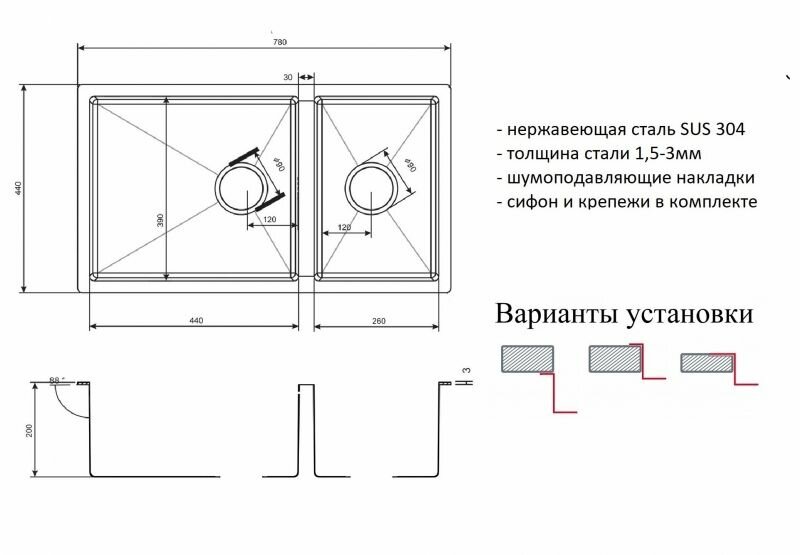 Мойка для кухни ZorG Sanitary R 78-2-44Производитель: ZorG Sanitary Серия: R Артикул: R 78-2-44Модель мойки Zorg R 78-2-44 представлена в серии ZORG R INOX . Производится из высококачественной легированной нержавеющей стали с содержанием хрома 18%, никеля 10% и обладает всем достоинствами этого материала. Мойка абсолютно гигиенична и безопасна для продуктов. Характерными особенностями серии моек Zorg R является плоский кант (3 мм) и радиусы скруглений чаши (R10 мм), а также возможность устанавливать мойку тремя способами установки (врезной монтаж, в один уровень и подстольный монтаж). Матовая поверхность кухонной мойки ZORG R 78-2-44 достигается благодаря применению брашинга (шлифование специальными щётками). Мойка имеет непористую структуру, прекрасно моется и не подвержена коррозии. Особенности: строгий и лаконичный дизайн эстетичный плоский борт глубокие вместительные моечные чаши с радиусами скруглений R10 мм толщина стали 1,5 мм выполнена из нержавеющей стали марки SUS 304 ( ГОСТ 08Х18Н10Т ) три способа монтажа оборачиваемая модель шумоизоляционное покрытие и накладки на обратной стороне Комплект поставки ZORG R 78-2-44: Мойка, сливная арматура с двумя корзинчатым вентилями 3 1/2, сифон с отводом, комплект креплений.