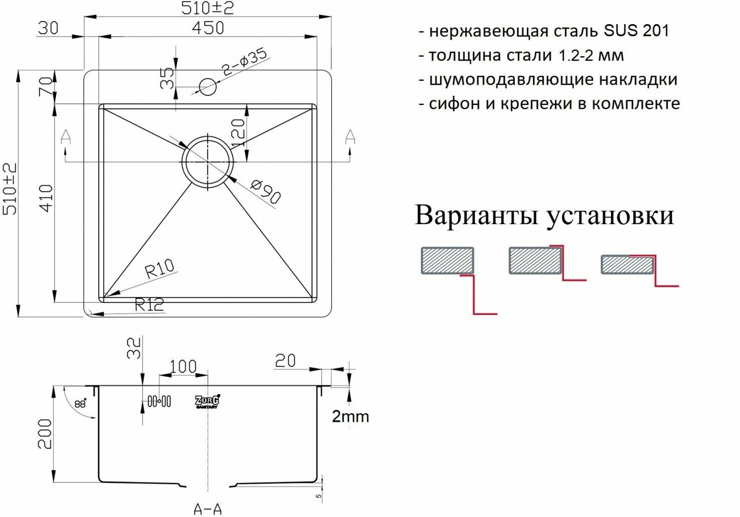 | Толщина материала мойки, мм | 2 |