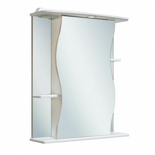 Зеркальный шкаф RUNO ЛИЛИЯ – отличное решение для стильного оснащения ванной комнаты. Шкафчик в ванную имеет одну распашную фигурную дверцу с зеркальным фасадом, по бокам две открытые полки. В шкафу имеются две внутренние полки. Шкаф для ванной оборудован одним врезным светодиодным светильником 220 В, розеткой с выключателем, петлями со встроенным доводчиком. Мебель для ванной RUNO – красота и практичность в мелочах!