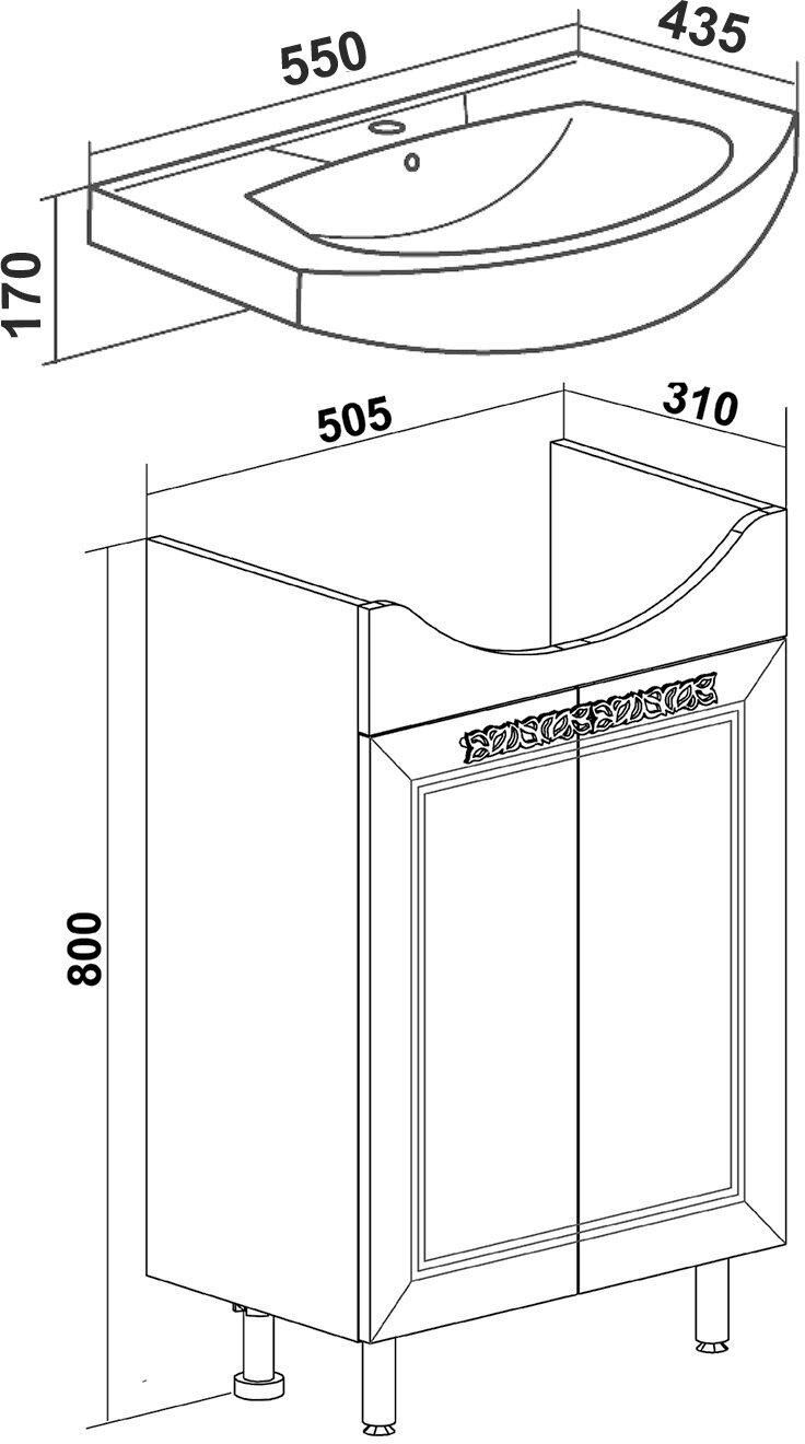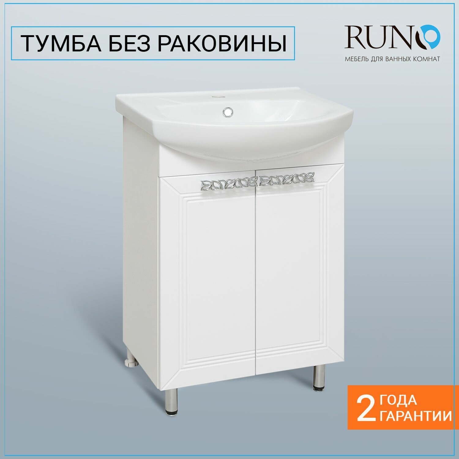 Тумба под раковину RUNO монро - современный изящный дизайн мебели для ванной в классическом белом цвете. Стильная фрезеровка и оригинальные ручки придают изделию утонченность и шик. Тумба в ванную монро (напольная) имеет две распашные дверцы и одну внутреннюю полку. В комплекте идут петли со встроенным доводчиком, одна ручка, 2 хромированные и 2 пластиковые ножки. К тумбе для ванной подходит керамическая раковина "Элеганс" (550*440 мм). Раковина имеет глубину 17 см. Мебель для ванной RUNO - красота и практичность в мелочах!
