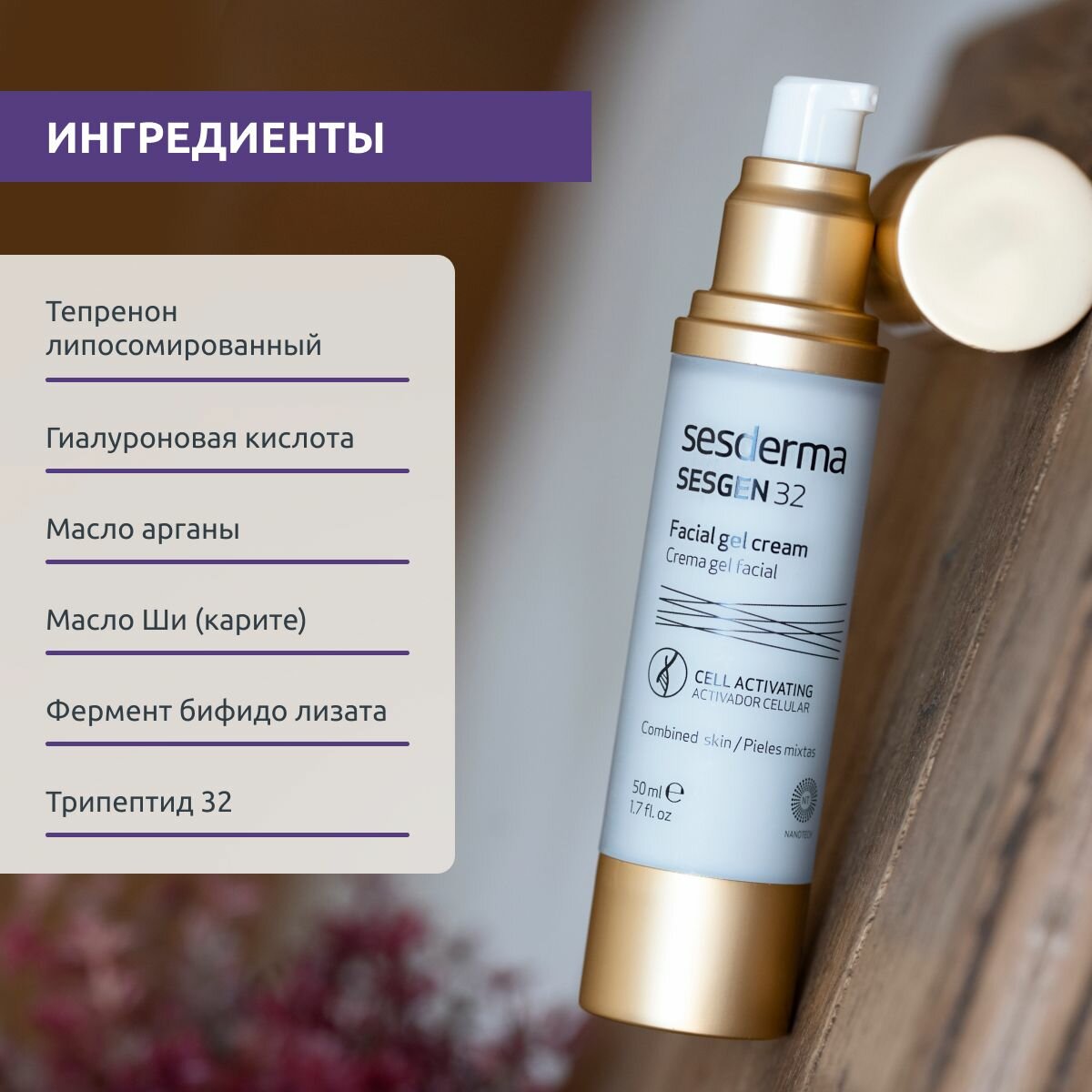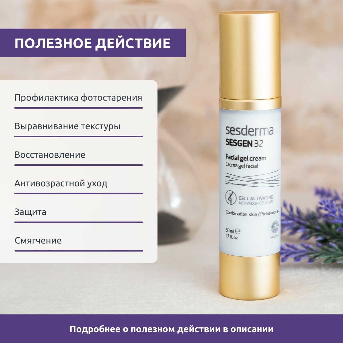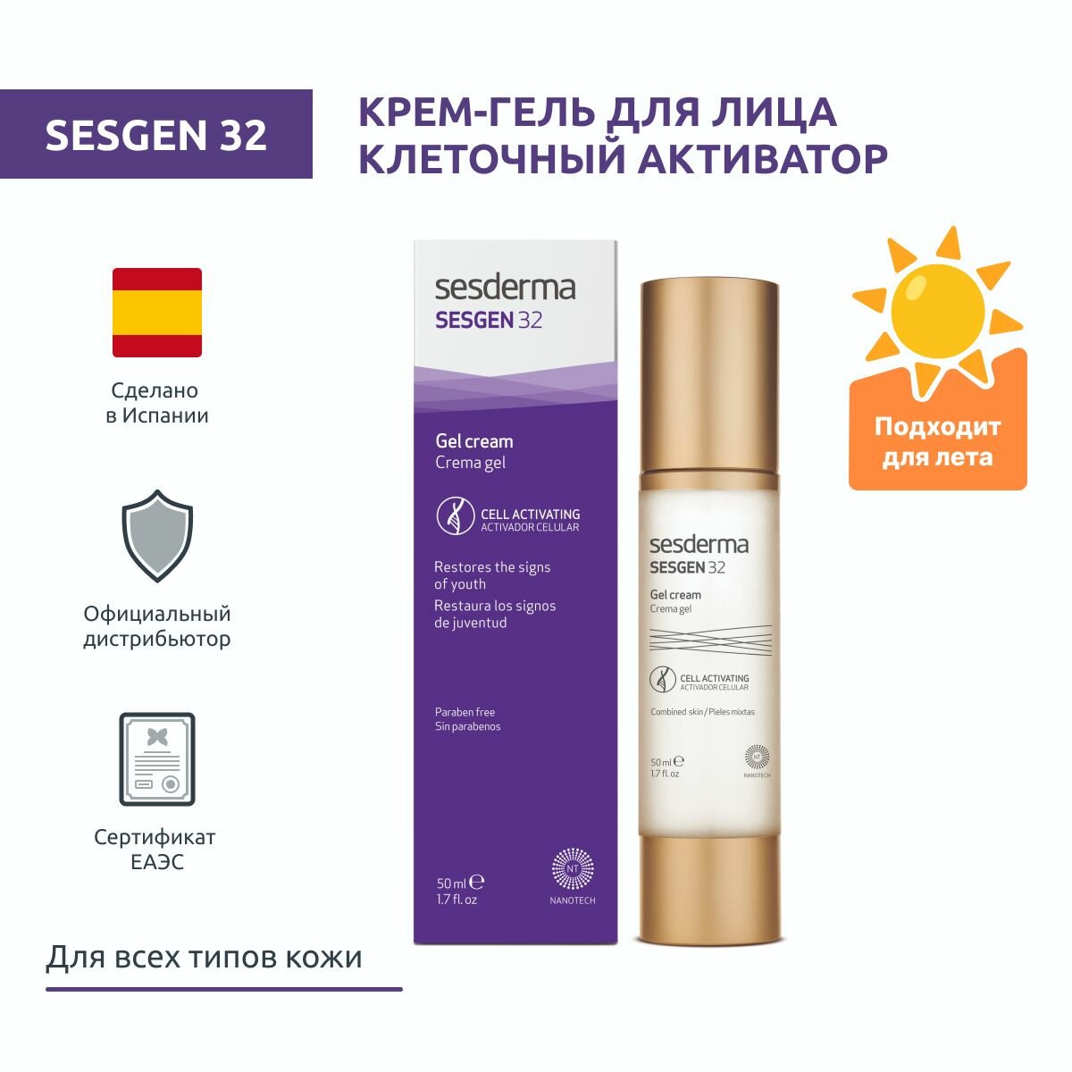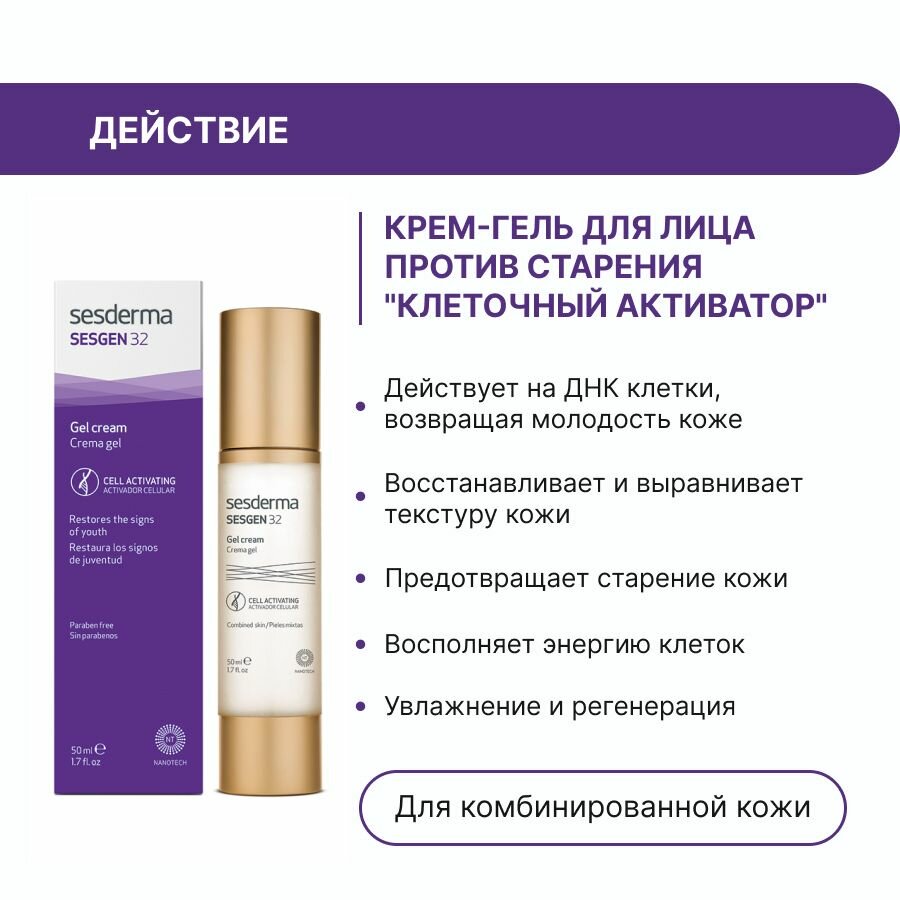 Комплексное антивозрастное средство с активными ингредиентами, созданными с помощью новейших технологий, замедляющими биостарение кожи. В то время как другие антивозрастные средства борются с видимыми проявлениями возрастных изменений, такими как морщины и потеря эластичности кожи, крем-гель Sesgen 32 воздействуют на саму причину старения и продлевает жизнь клеток кожи. Рекомендован для сухой и чувствительной кожи после 30 лет.