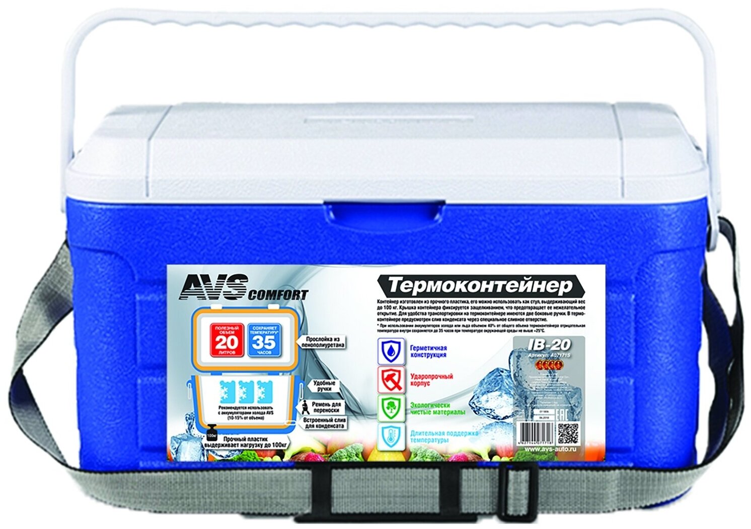 Термоконтейнер AVS (АВС) изготовлен из прочного пластика и имеет общую вместимость – 20 литров. Модель позволяет хранить продукты в прохладном состоянии до 35 часов. Продуманная конструкция корпуса оснащена удобной ручкой и регулирующимся плечевым ремнем для перемещения, а также есть специальный клапан, предназначенный для слива конденсата.