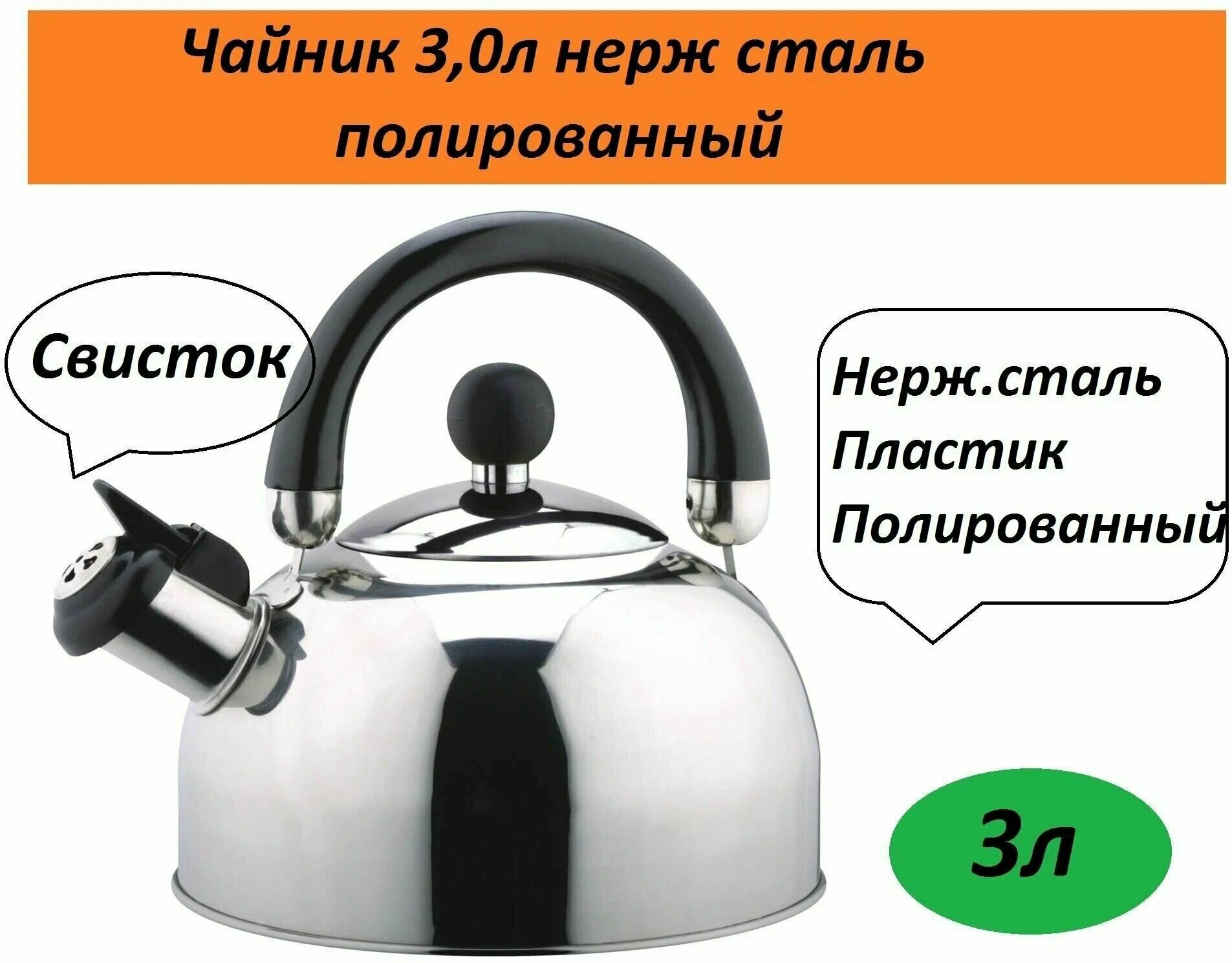 Чайник из нержавеющей стали со свистком капсульное дно. Полированный, внутри - матовый. Капсулированное 3-х слойное дно. Подходит для всех типов плит.