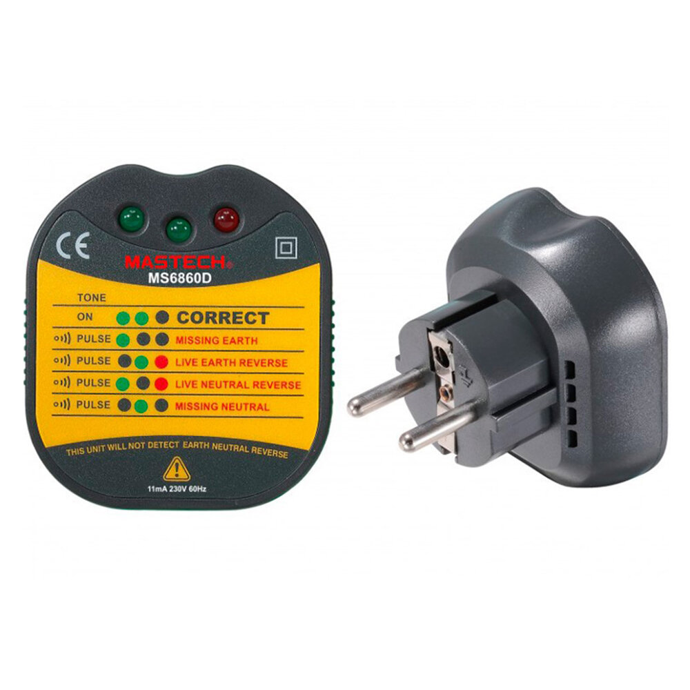Тестер розеток MASTECH MS6860D предназначен в первую очередь для контроля качества работы монтажной организации по установке евророзеток. Он оснащен световыми и звуковыми индикаторами. Тестер используется для проверки электрического питания в сетях (до 230 Вольт) и определяет различные нарушения в установленных розетках. При обнаружении неисправности тестер подает световой и звуковой сигнал.