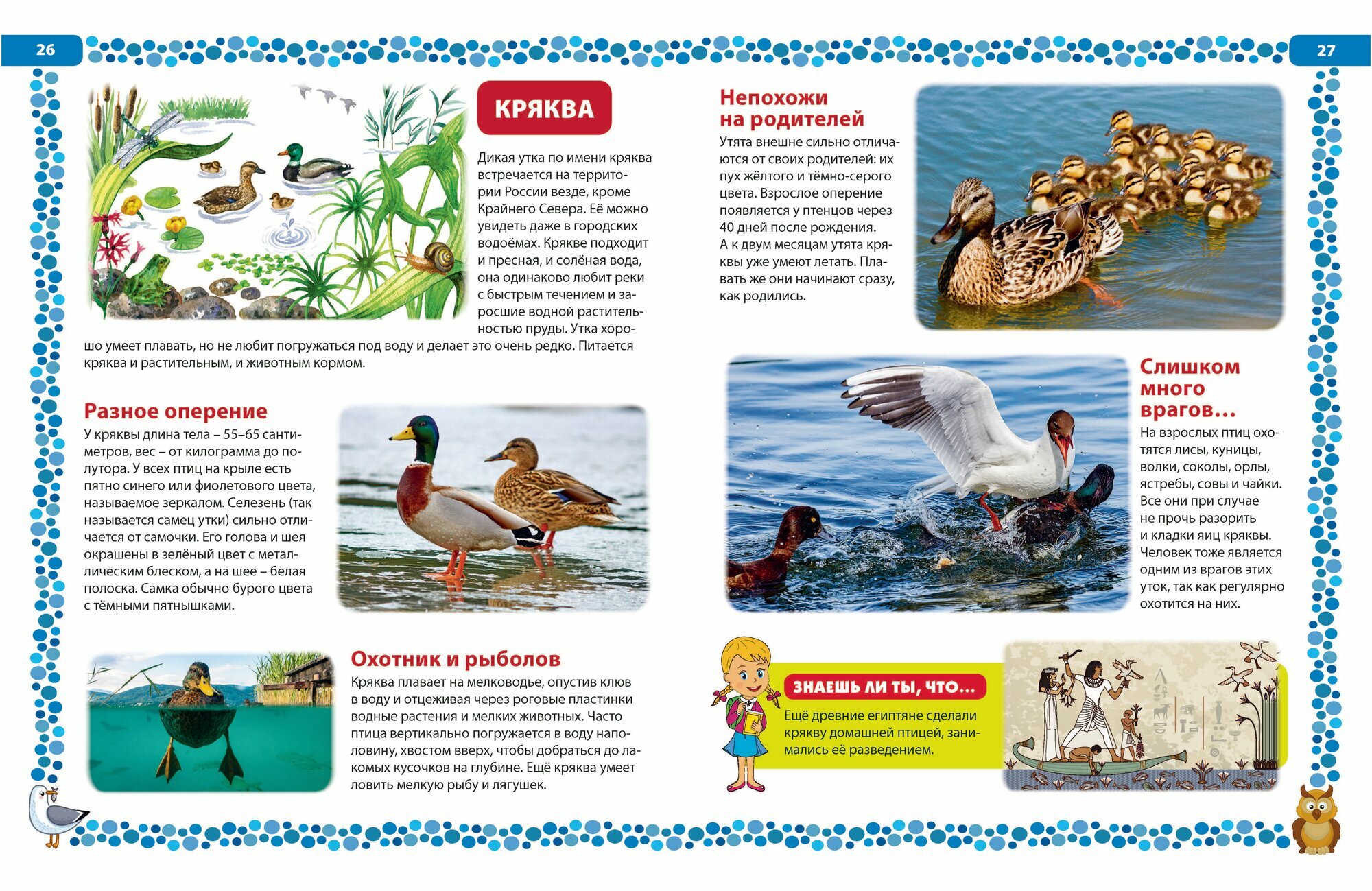 Мир пернатых богат и разнообразен. В зелёной тайге и густых лиственных лесах, в бескрайней степи и на водных просторах – в любом регионе нашей родины обитают самые разные птицы: огромный беркут и маленький воробей, певчий дрозд и крикливая кукушка, шумный дятел и спокойная сова, ловкая крачка и запасливая сойка. Наша энциклопедия не только познакомит ребёнка с повадками и характером птиц, но и расскажет об удивительных фактах из их жизни.