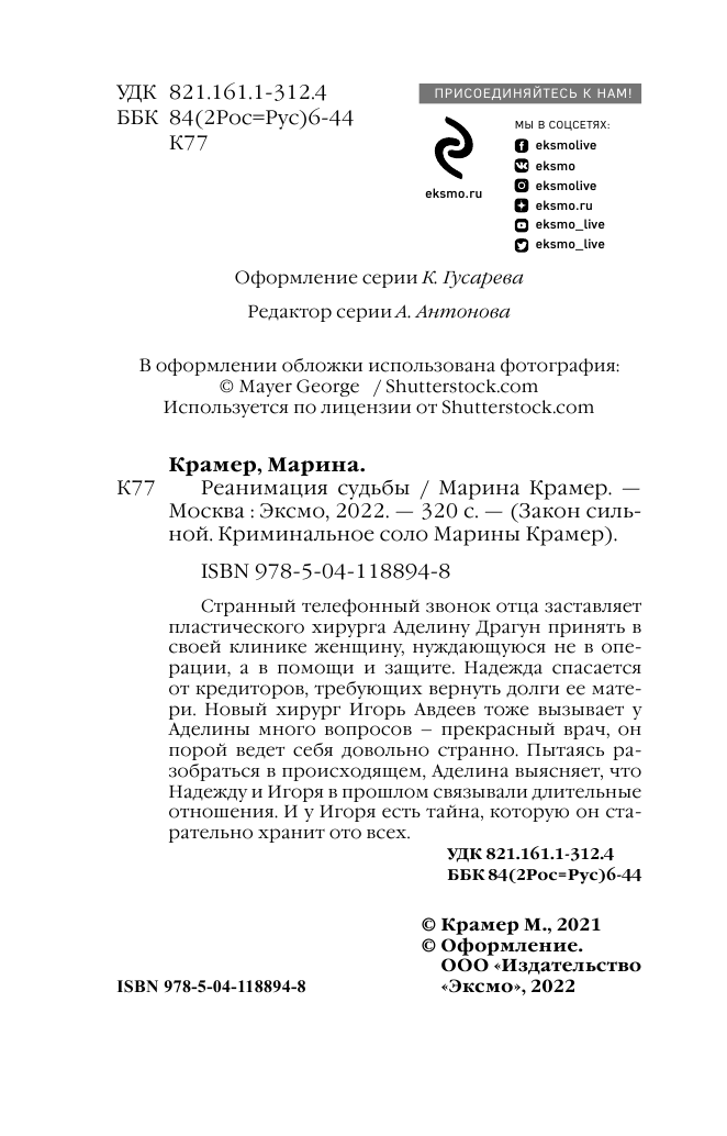 Книга: Реанимация судьбы (Марина Крамер); Эксмо, Редакция 1, 2022