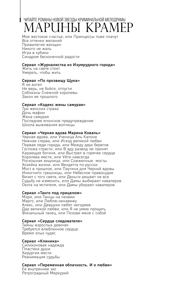 | Серия | Закон сильной. Криминальное соло Марины Крамер |