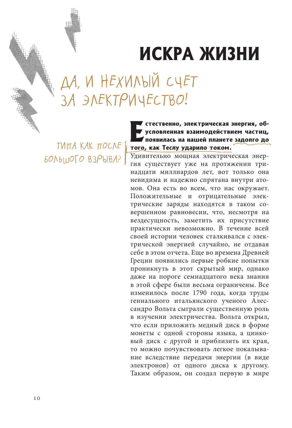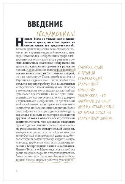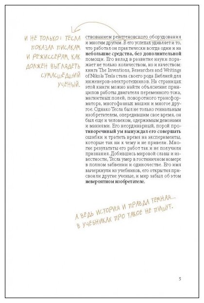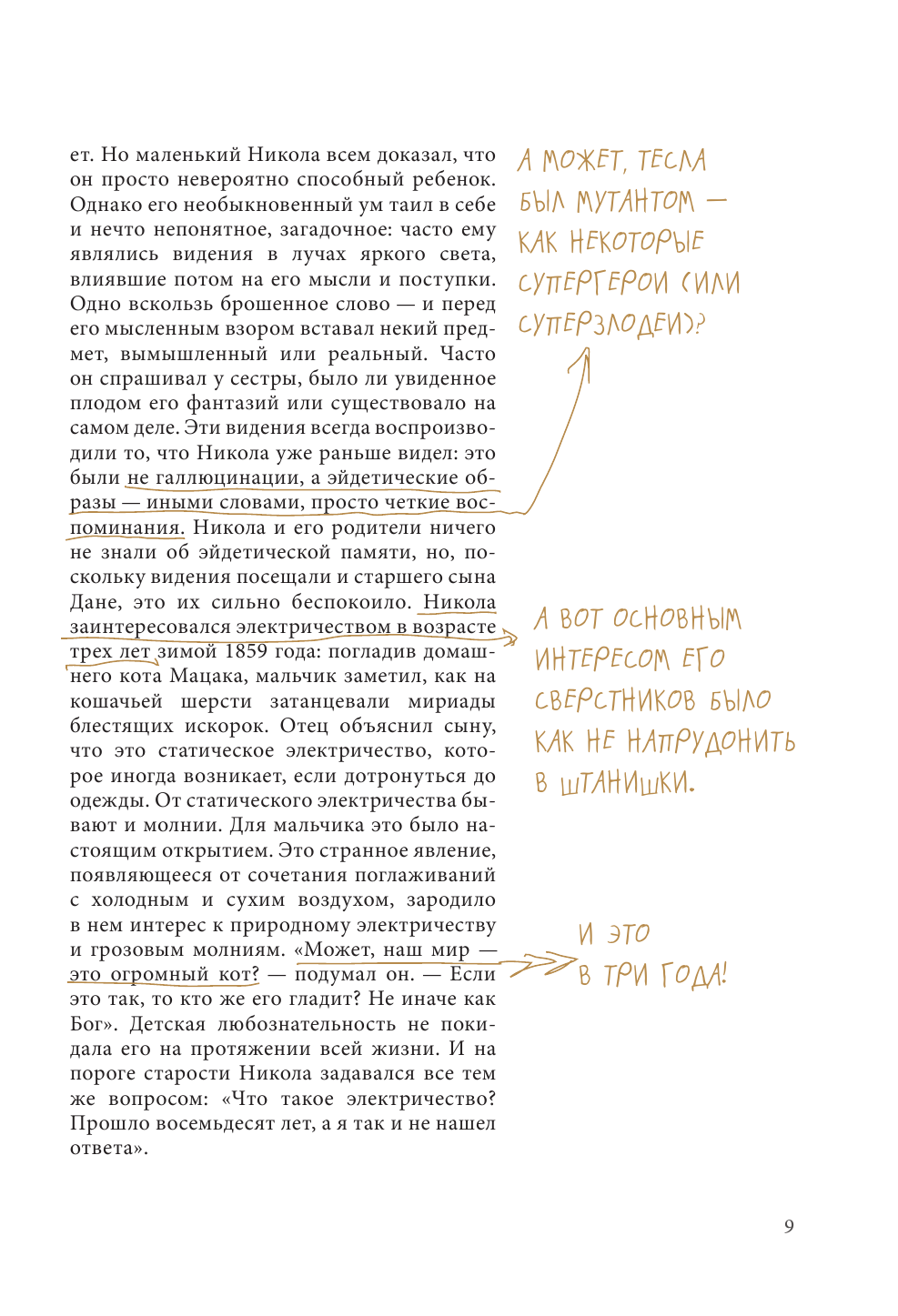Сейчас у многих «Тесла» ассоциируется исключительно с Илоном Маском, а не с человеком, носившем эту фамилию. Весьма печально, ведь судьба и открытия Николы Теслы крайне удивительны. Было интересно взглянуть на «реального» ученого, увидеть, как происходило его взросление и обучение, развитие и реализация многих смелых проектов. Вся книга выдержана в едином стиле. На полях оставлены классные комментарии и замечания.
