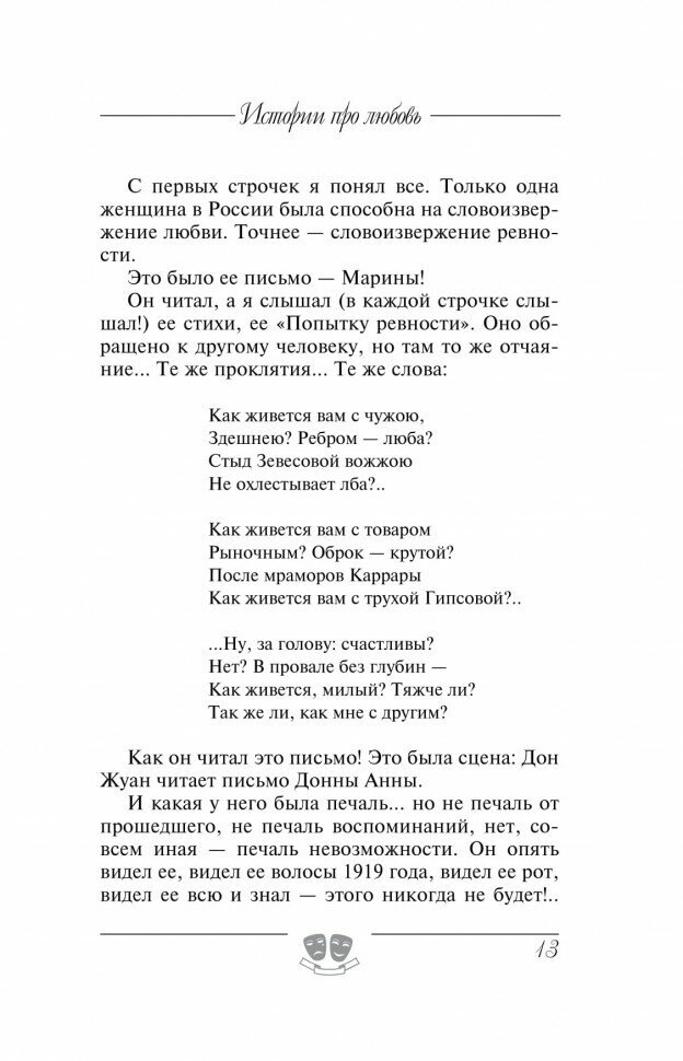 "Существует Она, которую я называю Прекрасная Женщина. Ее главный талант - способность любить. Она страдает умирает от любви… Чтобы воскреснуть и начать все вновь. Ее называют безумной, но счастье, которое она испытывает, не дано разумным. Нормальный Мужчина счастлив тем счастьем, которое испытывает. Прекрасная Женщина - тем счастьем, которое приносит…"