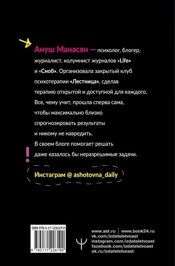 Подписана на Ануш давно и очень люблю ее читать. На данный момент ее книга – то что мне было нужно, во время чтения пришло много полезных осознаний, я намерена делать упражнения и техники из книги и чувствую, что мне помогает. Сначала не знала, покупать или нет, так как часть информации уже видела в ее телеграм канале, но купила и очень довольна. Рекомендую к прочтению, спасибо за полезную книгу)))