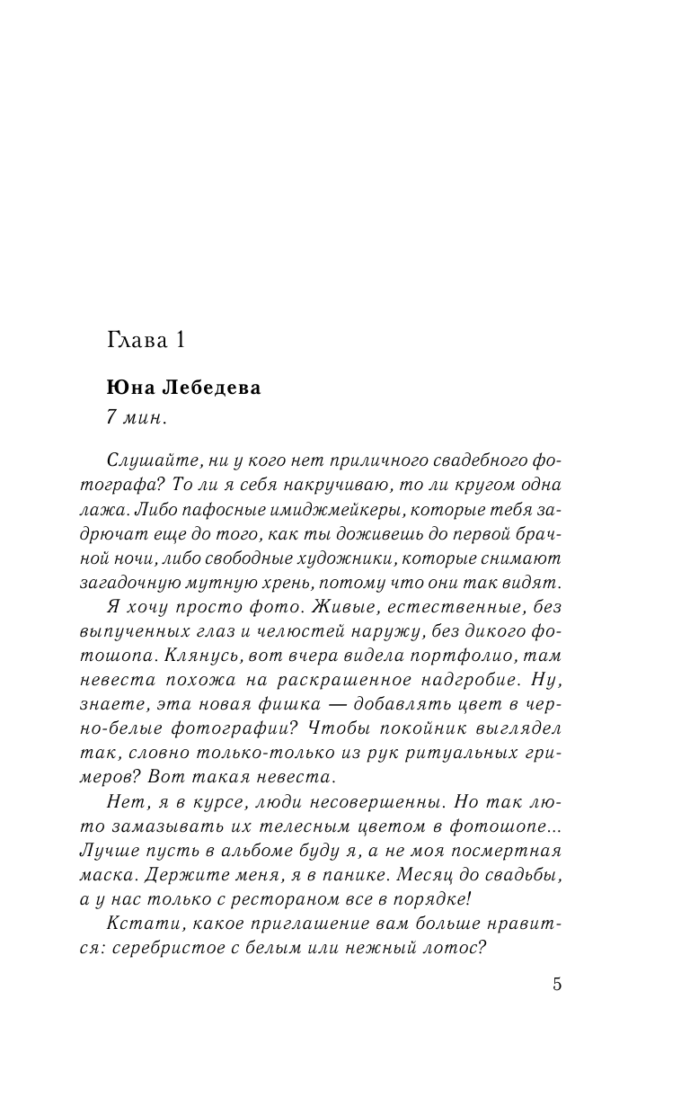 Свадьба требует тщательной подготовки, особенно если ты - дочка чиновника. Комплексы комплексами, но изволь, чтобы все было идеально: платье, ресторан, торт... Юне удалось справиться почти со всем, разве что хорошего фотографа она так и не нашла. Такого, чтобы и снимки отличные сделал, и угодил ревнивому жениху. Как-никак, профессионалы на дороге не валяются. По крайней мере, не валялись до того самого дня, когда Юна встретила Рому. Талант, да еще и гей? То, что нужно!