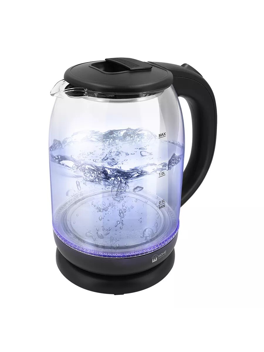 Легкий и прочный стеклянный чайник с голубой внутренней подсветкой в стильном прозрачном корпусе из закаленного стекла.