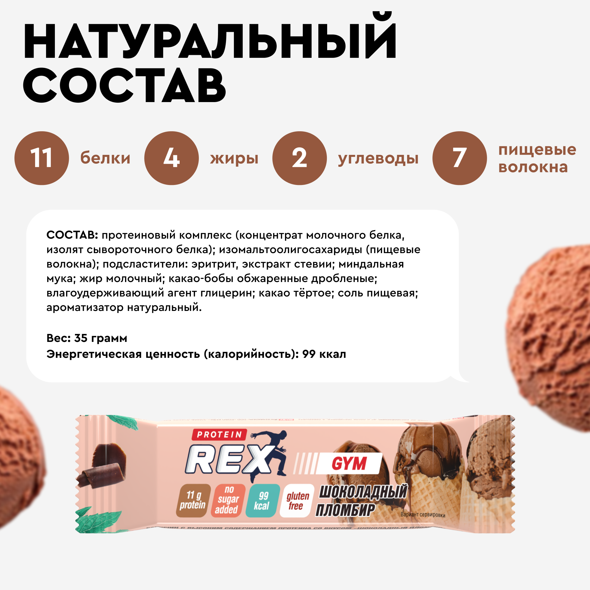 Протеиновые батончики без сахара LOW CARB низкокалорийные, 18 шт х 35г, 99 ккал.LOW CARB — это мини-версия высокобелковых батончиков из линейки GYM. Несмотря на компактный размер, в наших ПП-сладостях все еще много полезных веществ.Если вы ищете здоровый перекус, батончик с низким содержанием углеводов — идеальный вариант, потому что:11 г БЕЛКА и 7 г ПИЩЕВЫХ ВОЛОКОН для крепких мышц и костей дополнят спорт питание для набора массы;99 ККАЛ — идеальный объем вписывается в любой КБЖУ;натуральные САХАРОЗАМЕНИТЕЛИ (эритрит, стевия) с НИЗКИМ гликемическим индексом подходят для ПП-питания;яркие ВКУСЫ и большой ассортимент помогают найти любимое угощение среди всех полезных сладостей и диетических батончиков от REX.Когда вы ищите диетическое питание, спортивные батончики без сахара от Protein Rex — подарок! Оказывается, фитнес батончики могут быть вкусными, сочетая в себе свойства спортпита и насыщенного десерта.Выбирая энергетические батончики, полезное питание и протеиновые сладости, вы выбираете себя и активную, здоровую жизнь!Попробуй всю линейку бренда “Протеин Рекс”. ProteinRex — продукты без сахара с отличным вкусом и высоким качеством, подтвержденным отзывами покупателей. Протеиновые батончики, протеиновое печенье, протеиновые хлебцы, низкокалорийные пирожные стали лидерами продаж в магазинах спортивного питания. Состав: протеиновый комплекс (концентрат молочного белка, изолят сывороточного белка); изомальтоолигосахариды (пищевые волокна); подсластители: эритрит, экстракт стевии; миндальная мука; жир молочный; какао-бобы обжаренные дробленые; влагоудерживающий агент глицерин; какао тёртое; соль пищевая; ароматизатор натуральный.