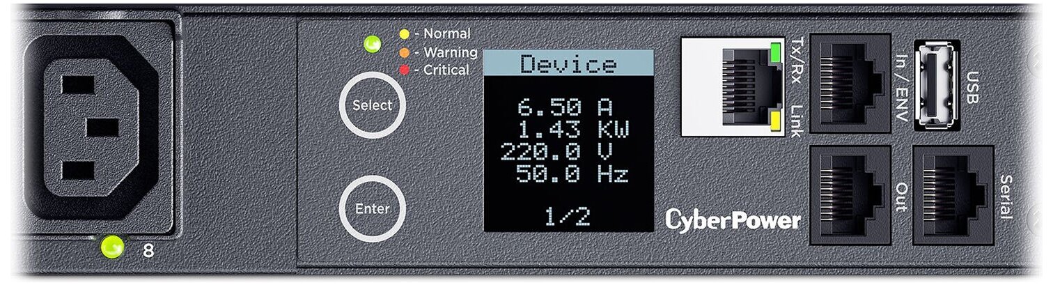 | Прочие особенности и свойства | CyberPower PDU41005 обеспечивает подачу питания от устройства ИБП, генератора или электросети на несколько подключенных устройств в ИТ-средах. Устройство поддерживает удаленное управление отдельными розетками по сети, что позволяет администраторам удаленно включать / выключать подключенные устройства. Реализована возможность установить последовательность включения/выключения питания отдельных розеток. Функция группирования также позволяет осуществлять мониторинг и управление PDU, соединенных в группу по одному IP-адресу., , Поворотный цифровой ЖК-дисплей поддерживает «горячую» замену, настраивается по цвету, что облегчает обслуживание PDU. Возможность изменять цвета ЖК-дисплея позволяет наглядно распределить устройства между несклькими компьютерами в серверной комнате и ИТ-средах., , В устройство встроен модуль Ethernet, который может работать с программным обеспечением PowerPanel® Power Management Software и веб-интерфейсом управления питанием для удаленного мониторинга и настройки в режиме реального времени. Регистрация событий через веб-браузер или сетевое соединение позволяет пользователям просматривать историю состояния электропитания. Реализована система автоматических уведомлений о событиях по электронной почте, в виде SMS-сообщений или через SNMP протокол назначенным пользователям, чтобы они могли предпринять немедленные действия. Порт USB поддерживает легкое обновление прошивки. Кроме того, порт RJ45 позволяет подключить дополнительный датчик окружающей среды (ENVIROSENSOR), который может обеспечивать мониторинг температуры и влажности в реальном времени в ИТ-центре., , СВОЙСТВА, Локальный / Удаленный мониторинг и управление в реальном времени, Работа в условиях высокой температуры, Дисплей с отображением нагрузки в реальном времени, Горячая замена ЖК-дисплея, Светодиодный индикатор состояния, Поддерживает ENVIROSENSOR, ПО для управления электропитанием PowerPanel®, Лоток фиксирующий шнур, , Управляемые розетки с функцией последовательности подачи питания., Металлический корпус промышленного класса, Настраиваемый пользователем цветной ЖК-дисплей, Поворотный ЖК-дисплей для правильной ориентации дисплея, Обновление прошивки через USB, Обновляемая пользователем прошивка, Регулируемые монтажные кронштейны, Закрытый IEC разъем |