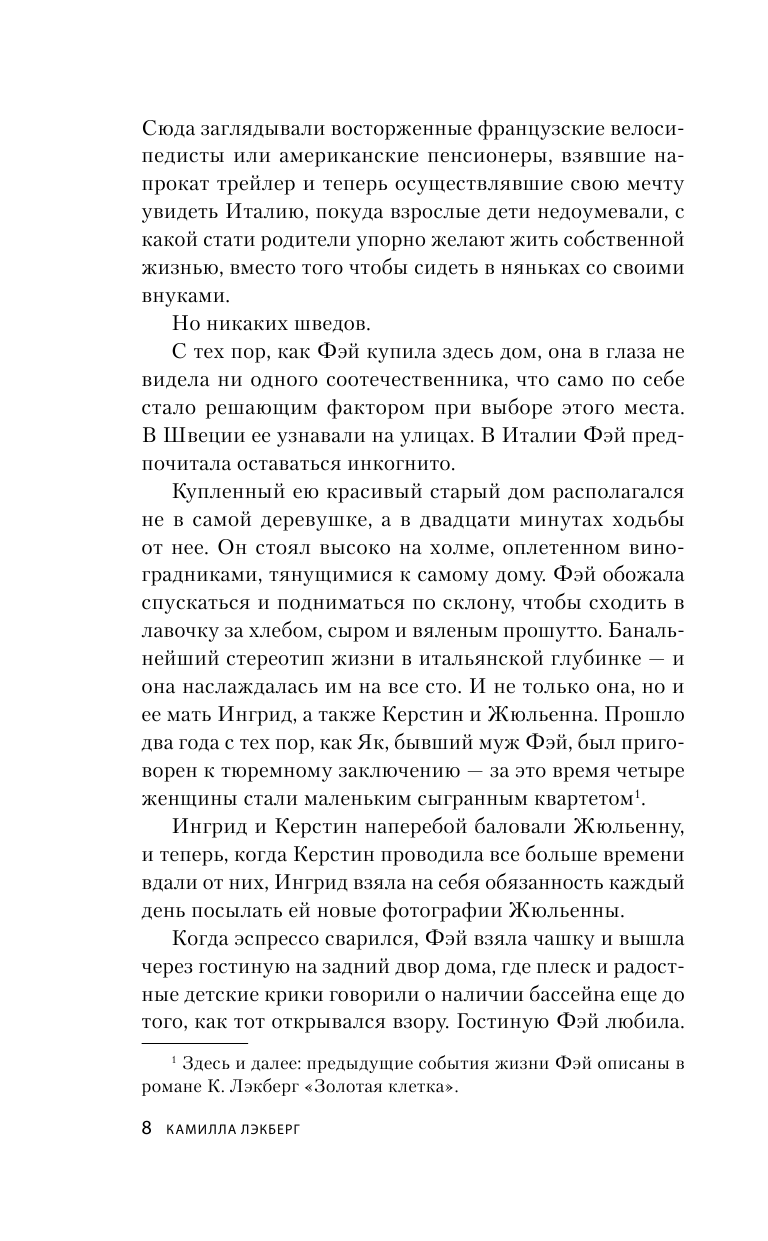 Купила не задумываясь, так как прочитала все ее книги, и очень ждала, когда появится новая. Очень плохая книг, тем более, после всех предыдущих книг Лэкберг. Сюжет предсказуемый с 10 страницы, тягостно читается именно на фоне первой книги («Золотая клетка»). Плохая копия книг С. Шелдона, герои как из плохого сериала. Не стоит тратить времени