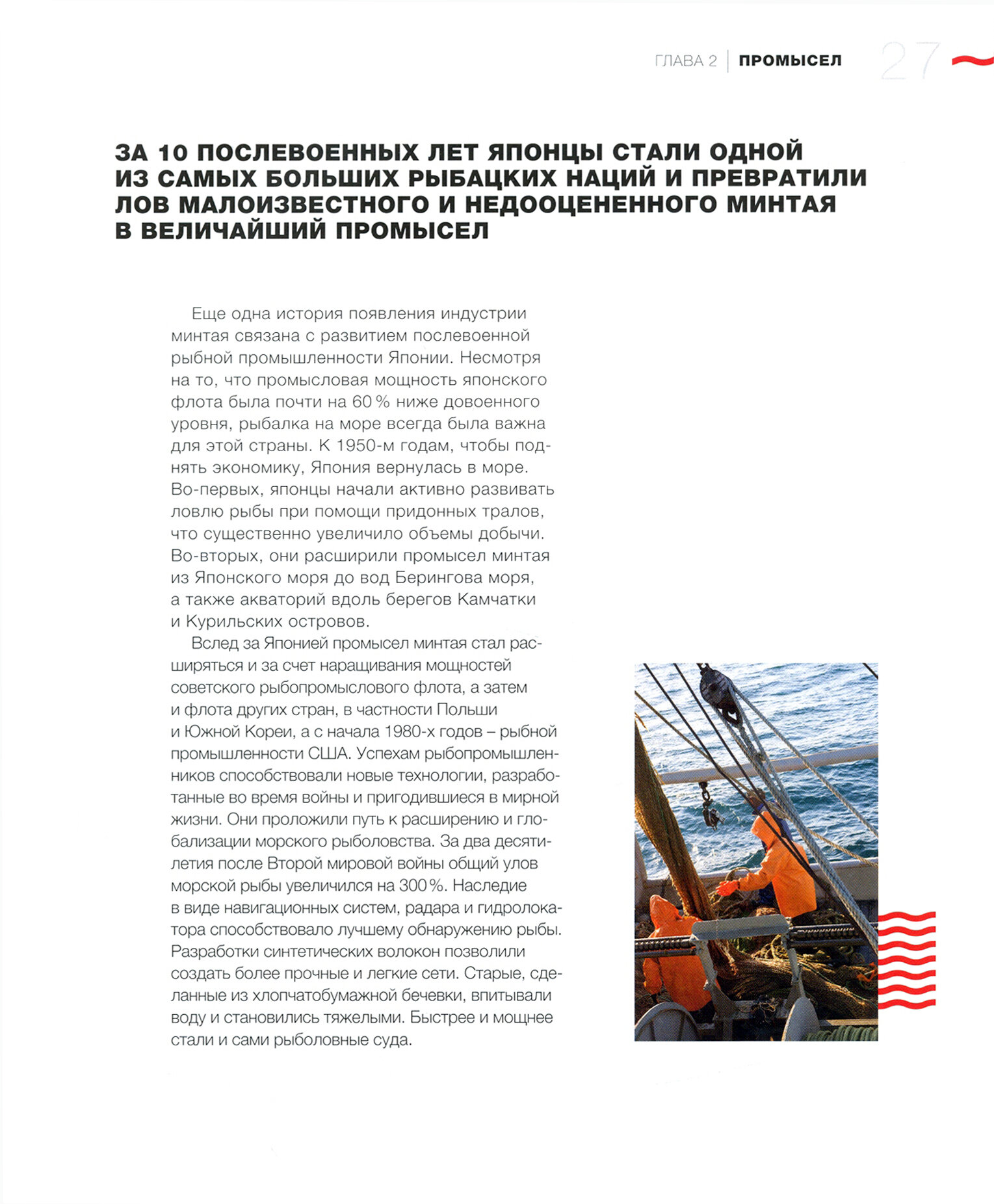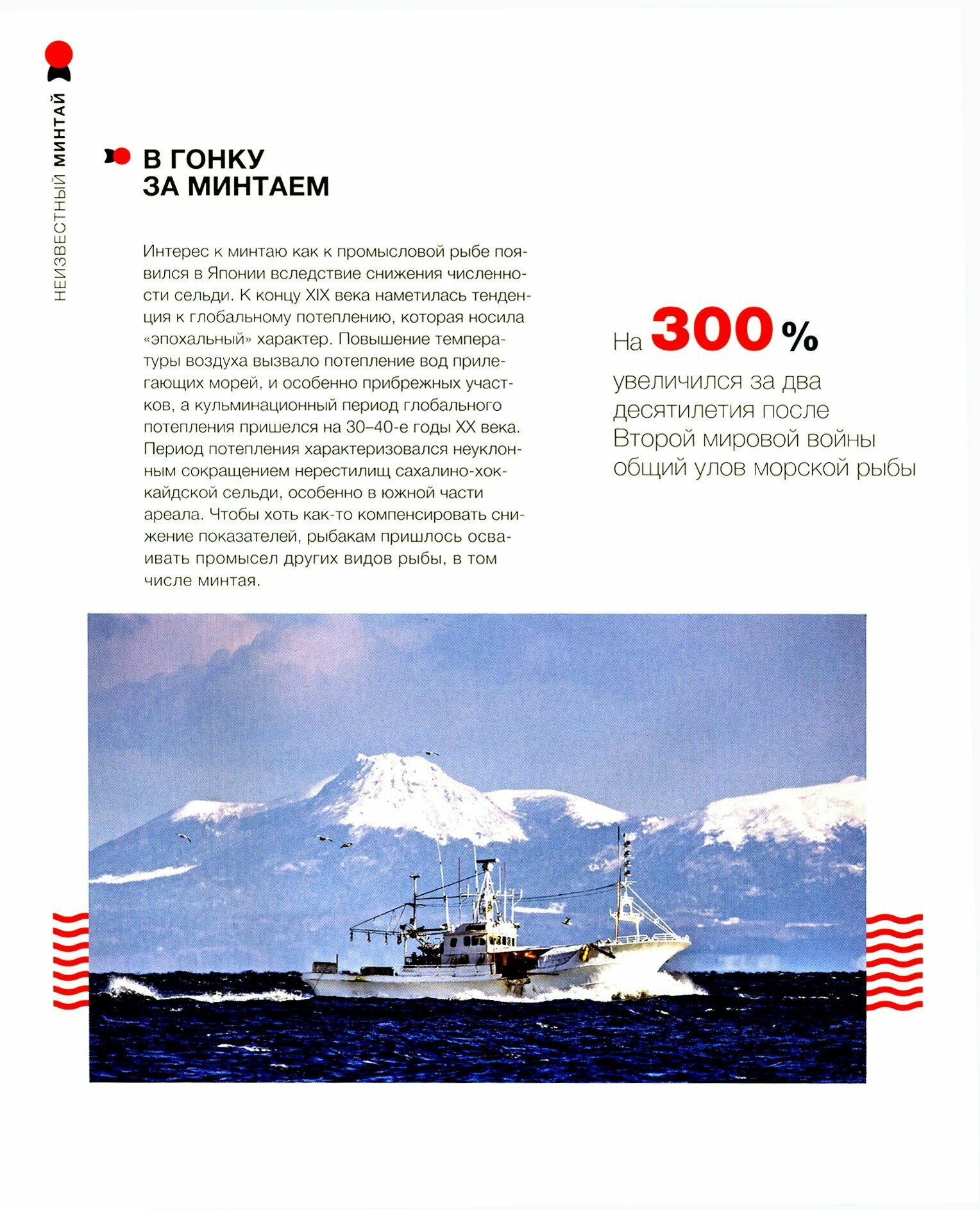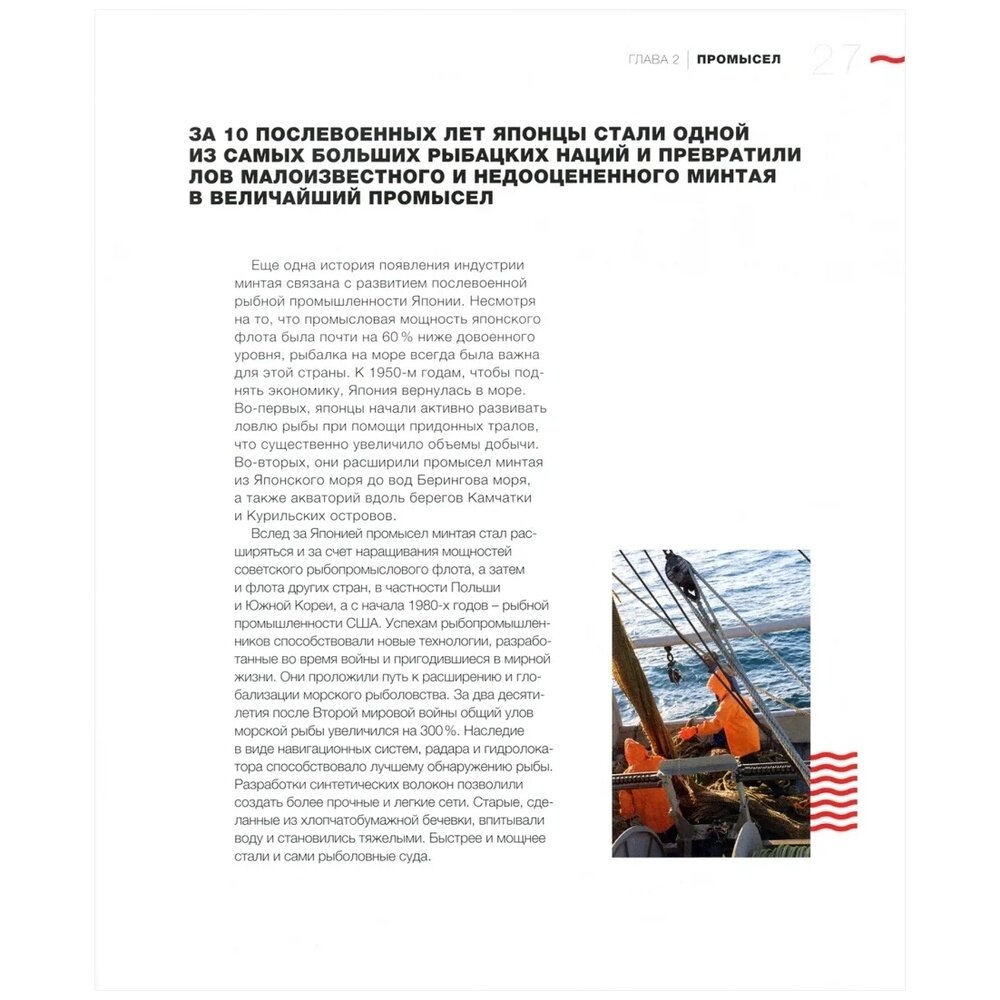 Многое узнать о, казалось бы, такой знакомой всем рыбе предлагает книга посвященная минтаю. История промысла в России и за рубежом раскрывает его экономические и политические составляющие. Подробное описание современной технологии добычи рыбы позволяет даже неспециалистам хорошо представить себе весь процесс. Молодому поколению может пригодиться информация о профессиях, связанных с добычей рыбы. А гурманы найдут в книге рецепты, которые наверняка их заинтересуют.