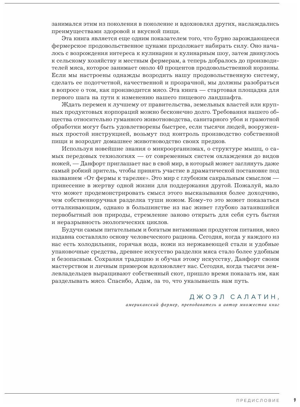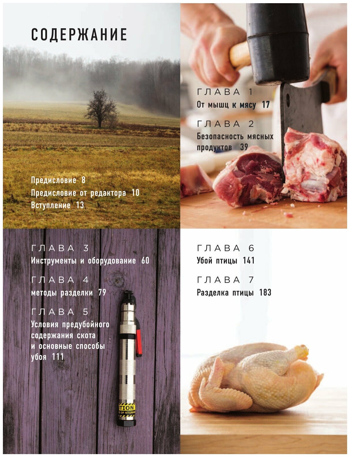 Как гуманно убить домашнюю птицу, кролика, овцу, козу, свинью. Как правильно ощипать или снять шкуру, разделать тушу, разрубить и разделить на товарные и порционные куски, упаковать и хранить. Какие инструменты наиболее удобны для выполнения той или иной манипуляции. Сколько мясо должно созревать и какие химические процессы в мясе происходят в это время. Как организовать рабочее пространство и обеспечить санитарную безопасность и многое-многое другое.