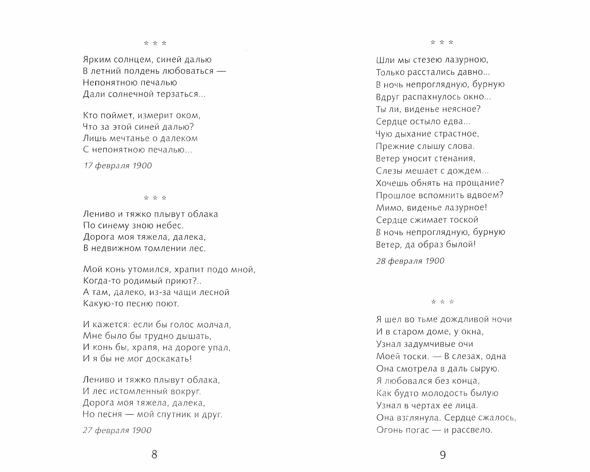 Александр Александрович Блок (1880-1921) сам подготавливал к изданию сборники своих стихотворений. Поэт делил свою лирику на три книги, каждая из которых включала определенные циклы. Поэтому в нашем сборнике вначале представлены стихотворения из этих трех книг, с сохранением структуры, предложенной самим автором в его последних прижизненных изданиях. Мы также указываем день, месяц и место создания произведения, как это делал поэт. Кроме того мы сохраняем авторскую орфографию и пунктуацию, о которых А. Блок писал редактору одного из изданий: "Всякая моя грамматическая оплошность в стихах не случайна, за ней скрывается то, чем я внутренне не могу пожертвовать; иначе говоря, мне так "поется"".