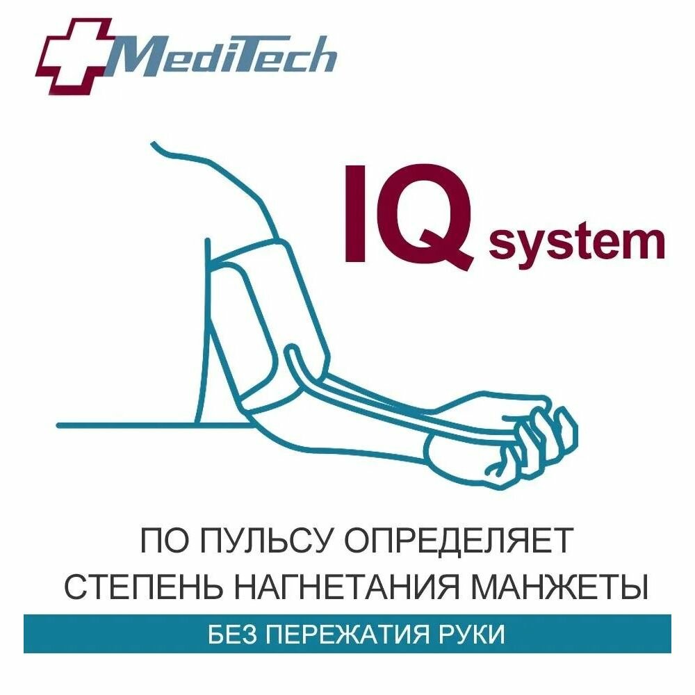 • Технология интеллектуального измерения IQ system учитывает ЧСС (частоту сердечных сокращений) пользователя при измерении, определяет оптимальный уровень нагнетания манжеты для каждого человека, обеспечивая комфортное измерение и точный результат. Правильный уровень давления в манжете позволяет получить точный результат, избежать излишнего сжатия руки;