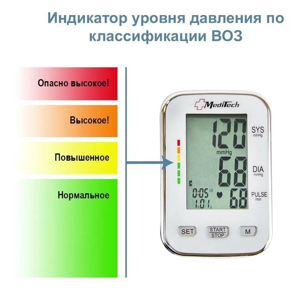 • Цветная индикация давления по классификации ВОЗ позволяет оценить результат, определить нормальное давление и гипертонию 1, 2 и 3 степени;