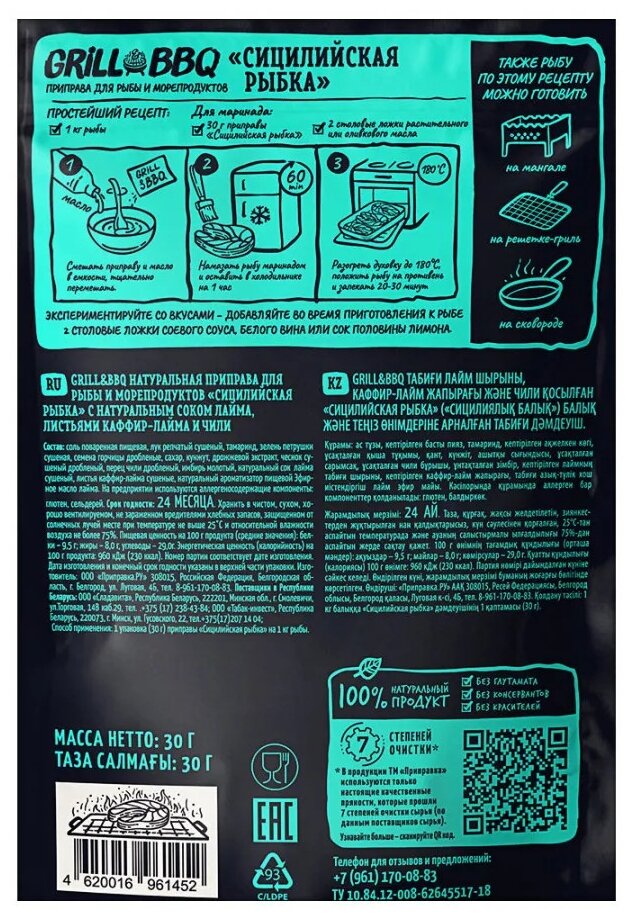 Приправа "Сицилийская рыбка" с соком лайма и чили для рыбы и морепродуктов - это исключительная комбинация душистых трав и сушеных овощей. Благодаря разнообразию ингредиентов в составе приправы покупатель откроет для себя новые грани вкуса. Ее можно использовать в рыбных котлетах, пирогах и бульонах. Универсальный способ приготовления: сковорода, СВЧ-печь, духовка, открытый огонь (мангал, гриль). Можно использовать круглый год, любым способом приготовления. 100% натуральный состав: без красителей, усилителей вкуса.