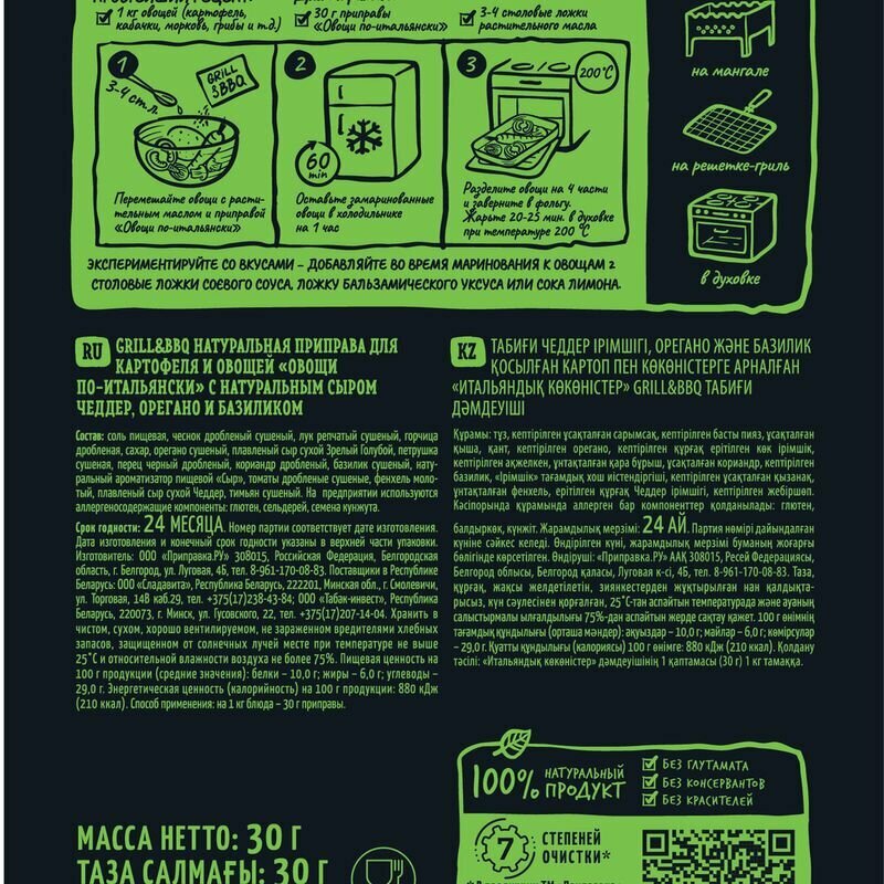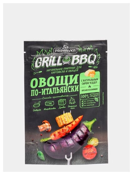 Овощи по-итальянски с натуральным сыром чеддер, орегано и базиликом. Подходит для любого вида мяса (птица, свинина, говядина, баранина), универсальный способ приготовления: сковорода, микроволновка, духовка, открытый огонь (мангал, гриль). Можно использовать круглый год для любого мяса любым способом. 100% натуральный состав, без красителей, усилителей вкуса.