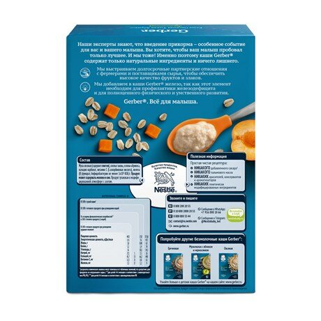 Идеальной пищей для грудного ребенка является молоко матери. В03 рекомендует исключительно грудное вскармливание в первые 6 месяцев и последующее введение прикорма при продолжении грудного вскармливания. Компания Нестле поддерживает данную рекомендацию. Проконсультируйтесь со специалистом, когда вводить в рацион ребенка эту кашу. Gerber знает, что введение прикорма - особенное событие для вас и вашего малыша. Вы хотите, чтобы ваш малыш пробовал только лучшее. И мы тоже! Именно поэтому каши Gerber содержат только натуральные ингредиенты и ничего лишнего. Мы выстраиваем долгосрочные партнерские отношения с фермерами и поставщиками сырья, чтобы обеспечить максимально высокое качество фруктов и злаков. Мы добавляем в каши Gerber® железо, так как этот элемент необходим для профилактики железодефицита и для полноценного физического и умственного развития.