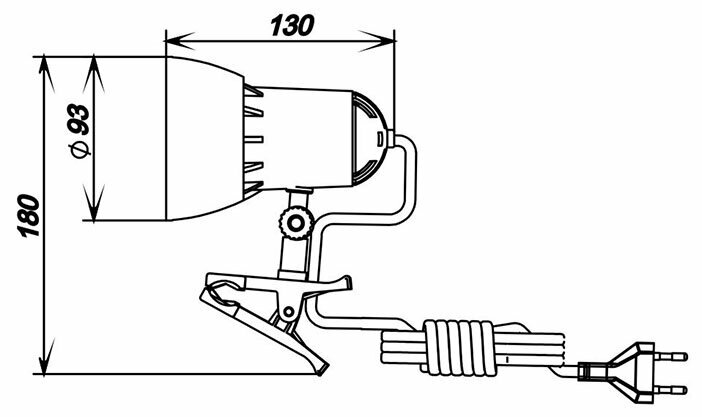 Голова светильника имеет 2 степени свободы. Светильник на прищепке. Очень удобно располагать светильник в местах с малым рабочим пространством и именно там, где необходимо что-то подсветить. В данном светильнике недопустимо использование лампы накаливания без зеркального покрытия.