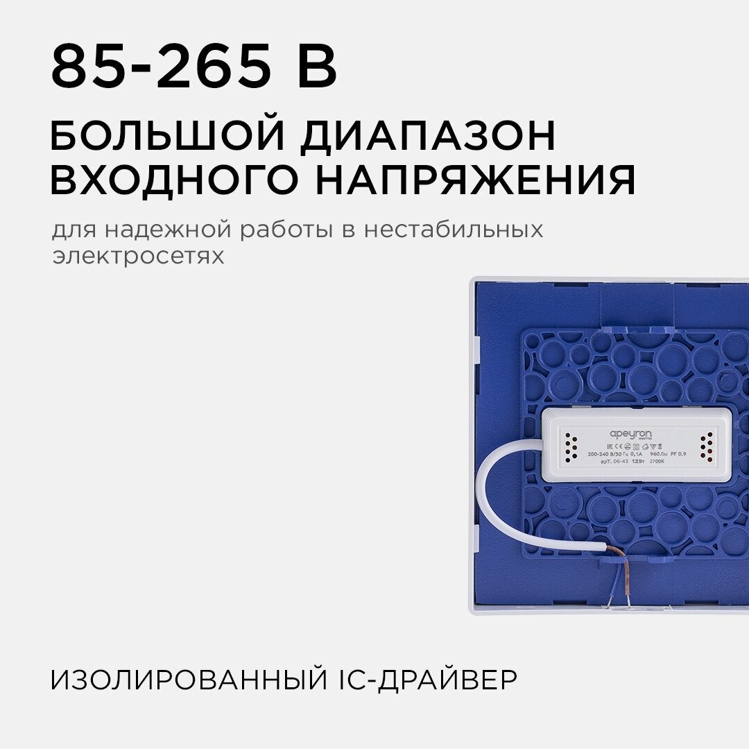 **Светильник точечный светодиодный накладной Apeyron ** излучает теплый белый свет. Температура цвета составляет 2700 К. Корпус белого цвета сделан из пластика, защищен от попадания пыли и влаги в соответствии с классом IP40. Работает от сети переменного тока. Для управления используют настенный выключатель.