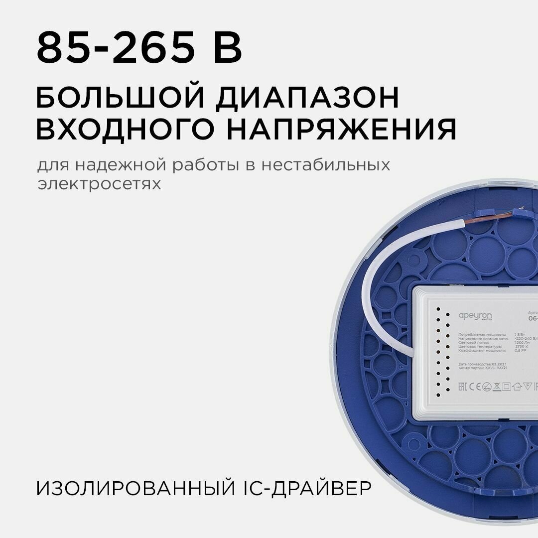 Сверхтонкая светодиодная панель Apeyron – это современный светильник в минималистичном алюминиевом корпусе со сверхузкими рамками, предназначен для освещения внутренних помещений. Мягкий и рассеянный свет светодиодной панели отлично справится с визуальным увеличением пространства! Благодаря непревзойденным свойствам и ультрамодному дизайну светодиодную панель можно применять для декорирования жилых помещений, частных домов, люксовых гостиниц, современных магазинов, престижных офисов. Светодиодные панели Apeyron полностью экологически безопасны, их можно также устанавливать в детских садах, школах и медицинских учреждениях.Благодаря оригинальным способам крепления потолок приобретет неповторимый и оригинальный дизайн, способный удовлетворить вкус даже самого требовательного потребителя.При изготовлении данного изделия используются только современные технологии, позволяющие полноценно заменять традиционное освещение.Светодиодная панель излучает световой поток в 1200Лм, потребляя при этом 15Вт, что в итоге дает энергоэффективность 80Лм/Вт. Цветовая температура 2700К - это цвет теплого предзакатного солнца. Теплый цвет свечения создает уютную атмосферу в помещении. Встроенный драйвер снимет вопрос о том, как его разместить, и облегчит монтаж светильника. Круглая форма корпуса позволит создать дизайн с оттенками вечности, тайны и магии. Накладной тип монтажа позволит смонтировать эту панель на любую плоскость, а наличие в комплекте всех необходимых для этого деталей подарит возможность не задумываться в последний момент, где их взять. преимущества:Срок службы более 7-ми лет;Ультратонкий и стильный дизайн;Легкий и прочный алюминиевый корпус; Высококачественный встроенный драйвер;Высокий уровень светооптических характеристик рассеивателя;Быстрый и легкий монтаж; Высокотехнологичный рассеиватель из поликарбоната с лазерной насечкой направляет большее количество света, по сравнению с обычным стеклом до 20%.