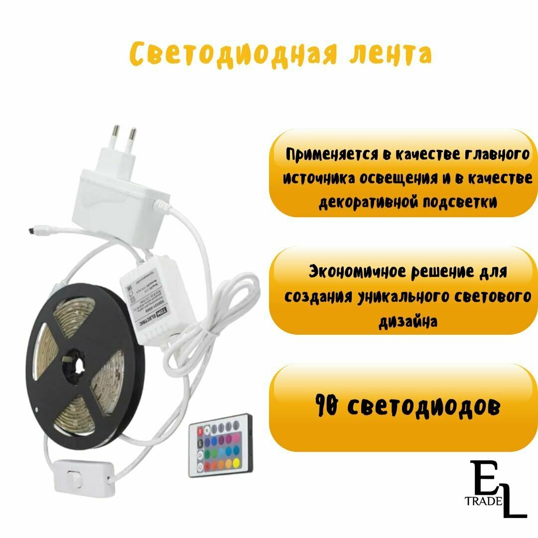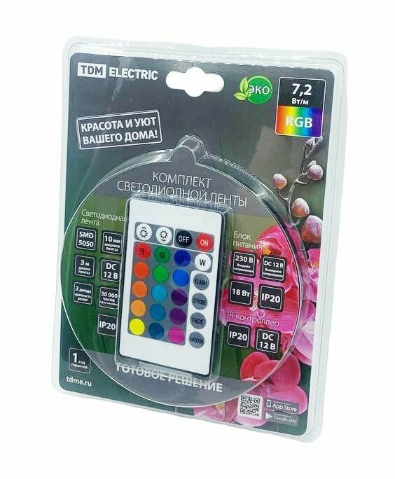 Назначение:Декоративное и контурное освещение.Применение:Простое решение монтажа светодиодной подсветки в квартире и на даче.Светодиодная лента является экономичным решением для создания уникального светового дизайна.Преимущества:В комплекте: светодиодная лента, адаптер, IR-контроллер (для RGB ленты).Монтаж комплекта светодиодной ленты настолько прост, что его можно выполнить самостоятельно, не имея специальных навыков.Оптимальный ассортимент для розничных магазинов: комплекты по 1, 3 и 5 м.Компактный адаптер в комплекте. Для мотажа ленты не понадобится много места. Выключатель на проводе адаптера обеспечит удобное управление светодиодной лентой.Упаковка:Пакет с европодвесом для комплектов 1 м. Блистер для комплектов 3 и 5 м.Групповая коробка для комплектов 1 м.Транспортная упаковка – картонная коробка.