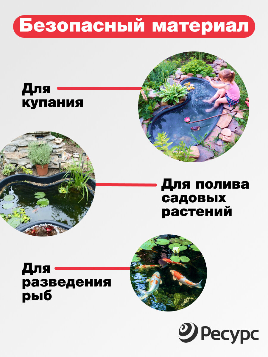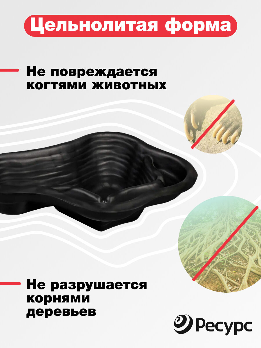 Чаша пруда изготовлена из утолщенного и прочного полиэтилена, устойчивого к ультрафиолету и морозу до -50°С. Пластиковая чаша, в отличие от пленки, не боится корней деревьев и собачьих когтей. Хорошо переносит небольшие удары и трение. Пруд устанавливается один раз и служит десятилетия.Процесс установки простой и быстрый: выкопать котлован, поставить чашу пруда, и можно приступать к созданию ландшафта1. Пруд необходимо закапывать в землю и укрывать борта декором2. В зимний период рекомендуется не сливать воду и использовать поплавки (бутыли, канистры)– распределять по поверхности воды (для поддержания нормального давления и с целью предотвращения деформации изделия).Дополнительно рекомендуем приобрести насос для фонтана, который не только украсит пруд, но и обеспечит рециркуляцию воды и поставку кислорода вглубь водоема. Генерируемые течения не дают жидкости застаиваться, что приводит к восстановлению экосистемы: