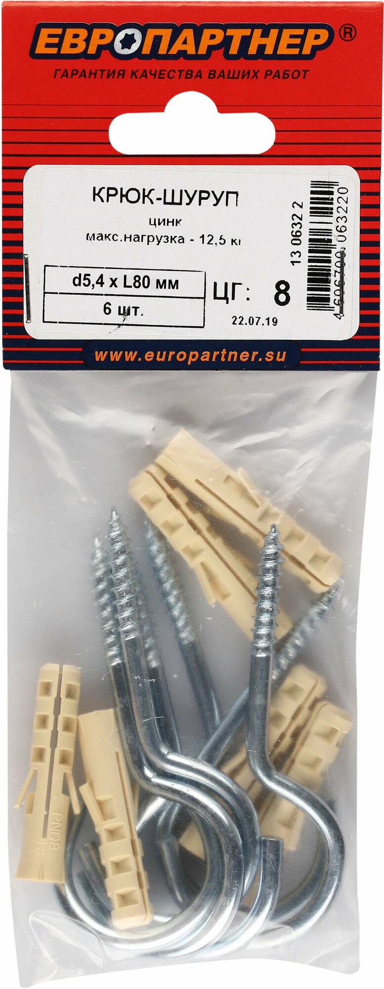 Крюк-шуруп Европартнер 54 х 50/80 оцинкованный 6 шт