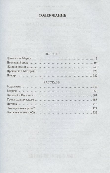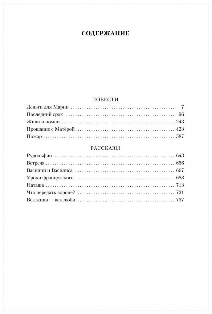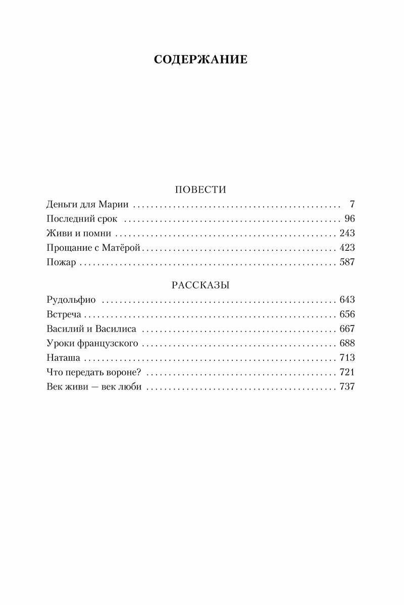 Великий писатель, с которым я встретился впервые, потому что, наверное, раньше до такого уровня литературы ещё не дорос. Все повести просто прекрасны, особенно понравилась \"Деньги для Марии\". Это, по-моему мнению, помимо всего прочего ещё и триллер, который от своего сюжета не отпускает от первых и до последних строк. А последняя фраза в последнем абзаце - это как в сердце нож. Пусть простят меня литературные критики за слово \"триллер\" по отношению к повести Распутина, но по другому я выразиться не смог. Происходит полное растворение собственной личности в чужом сюжете. Читаешь и словно бы чувствуешь себя находящимся непосредственно в образе героя, словно сам этой жизнью живёшь.