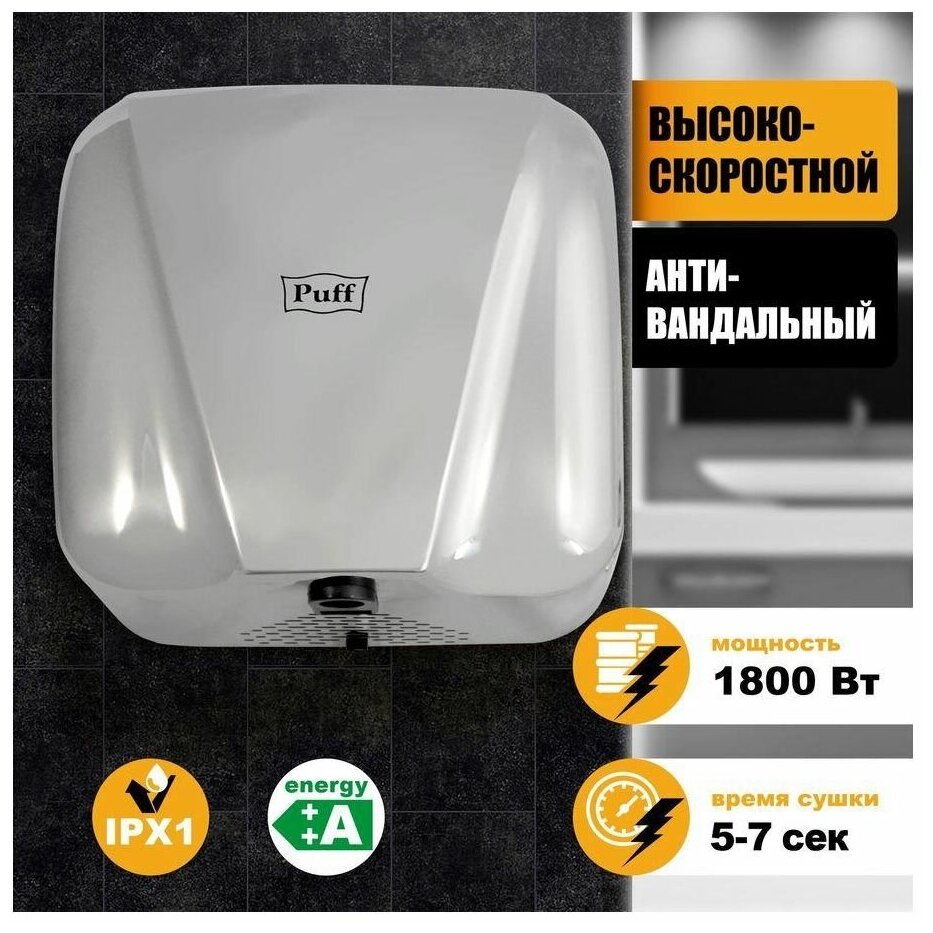 Puff – эталон надежности и качества. Настенная сушилка для рук Puff-8800С New Арт:1401.392 одновременно относится к двум типам, к высокоскоростному и антивандальному. Высокоскоростные электросушители для рук используются в местах, где необходимо сократить время пребывания посетителей в зоне высушивания рук — это аэропорты, ж/д вокзалы, стадионы, мега-моллы и прочие места с высоким трафиком посетителей общественных мест санитарно-технического назначения. Данная модель выполнена в стиле индустриального дизайна. Отличительной особенностью данной модели является оптимальная мощность 1800 Вт при внушительной скорости воздушного потока 95 м/с. С её помощью можно быстро высушить мокрые руки. Электрический сушитель не только испаряет воду с поверхности рук, но и сдувает капли воды мощным потоком воздуха. Время сушки занимает всего 5 - 7 секунд. Температура воздушного потока 40-54 °C. Использование сушителя для рук является экономически выгодным, чем использование бумажных полотенец.Puff-8800С New антивандального типа, а это значит, что электросушилка для рук крепится к стене с помощью скрытого крепежа - сначала необходимо открутить корпус с помощью специального ключа, закрепить шурупами на стене сушилку, установить на место корпус и зафиксировать его специальным ключом. Навесная сушилка из нержавеющей стали 304 марки. Эта модель устойчива к механическим повреждениям, что немаловажно, так как такое электрополотенце для рук устанавливают в местах с повышенным трафиком посетителей, а также в местах, где возможно небрежное обращение с оборудованием. Сушитель рук обладает системой защиты от перегрева. Работает электросушитель в бесконтактном режиме. Автоматическое включение происходит при помощи инфракрасного датчика. Зона срабатывания сенсора у полотенцесушителя 5-20 см. Продолжительность бесперебойной работы 35-40 секунд. Электросушители для рук Puff разнообразны. Кликнув на логотип бренда, вы сможете подобрать нужный вам вариант: погружной, малошумный (тихий), высокоскоростной, а также антивандальный.Основное конкурентное преимущество продукции торговой марки Puff – наилучшее соотношение цены и качества. На электросушители Puff распространяется гарантия 1 год.Уход: Очистку производить только при отключенном от сети питания электросушителя. Пользуйтесь мягкой тканью. Не используйте растворители, абразивные чистящие средства и едкие жидкости.