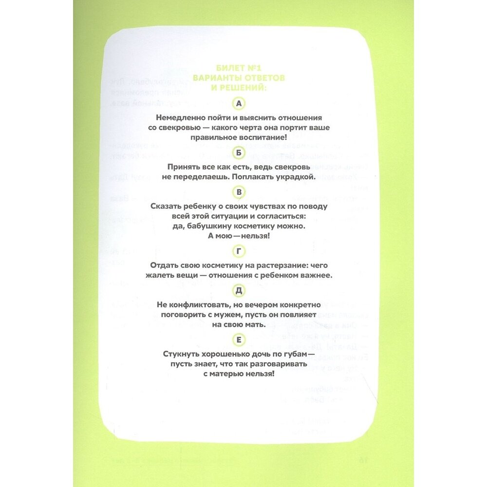 Екатерину Мурашову люблю и уважаю давно, с момента первого прочтения ее статей на Снобе. Читала почти все ее книги и всегда находила что-то полезное для себя. Книгу "Экзамен для родителей" ждала с нетерпением и конечно НЕ разочарована! Книга очень оригинальная, игровая, предложено множество очень разнообразных жизненных ситуаций, которые возникают в семьях с детьми разного возраста и несколько вариантов реакции родителя на эту ситуацию, из которых нужно выбрать свой "правильный" ответ. Книга дает пищу для размышлений и анализа. Очень еще порадовал рекомендованный список литературы. Уверенна, что не раз буду обращаться к этой книге по мере взросления дочери. Рекомендую всем родителям.