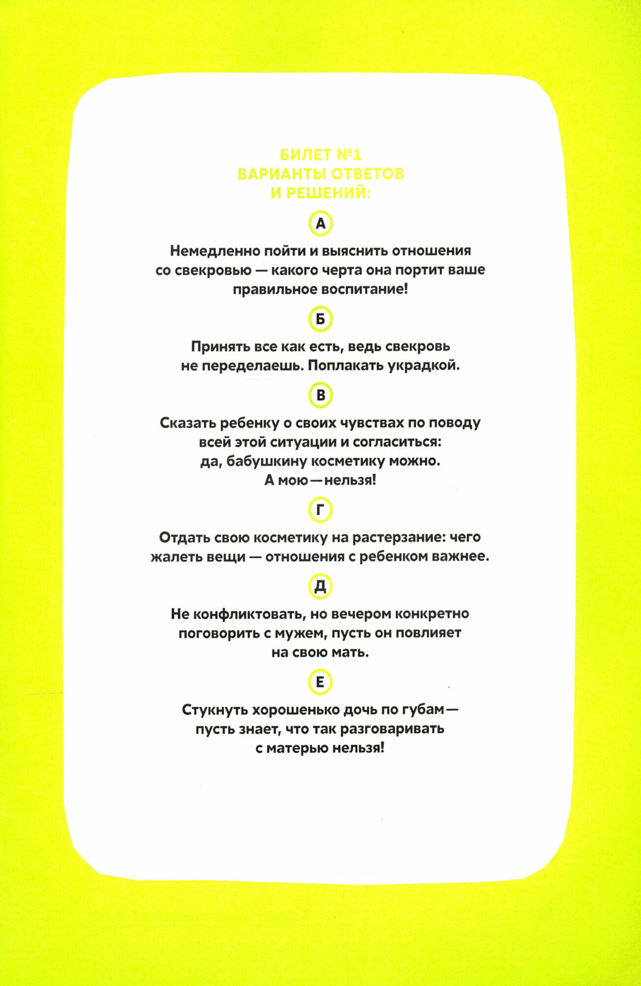 Билеты в нашем экзамене поделены на три части, по пятнадцать вопросов-ситуаций в каждой. В первой части семейные истории касаются детей от двух до пяти лет. Во второй - от шести до одиннадцати лет. И, наконец, в третьей части - ситуации, в которых участвуют подростки (от двенадцати до шестнадцати лет).
