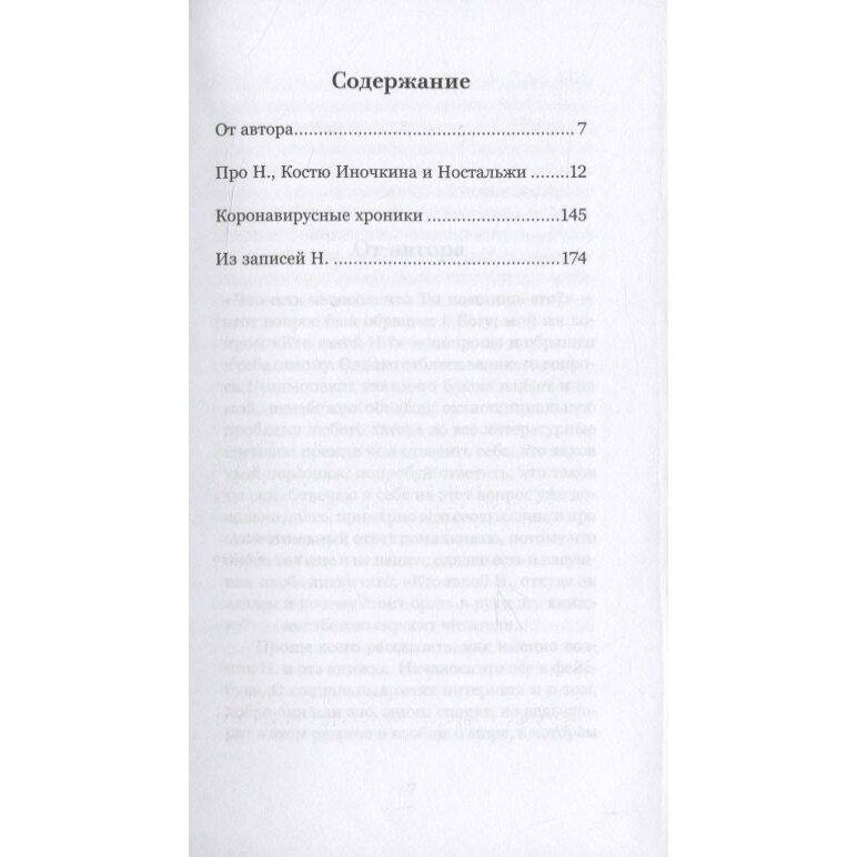 Несколько рассказов «Про Н.» появилось в знаковом журнале «Новый мир», теперь выходит их полное собрание в сопровождении «Записей Н.» — хитроумных и детски простых заметок литературного героя на полях нашей нынешней христианской жизни.