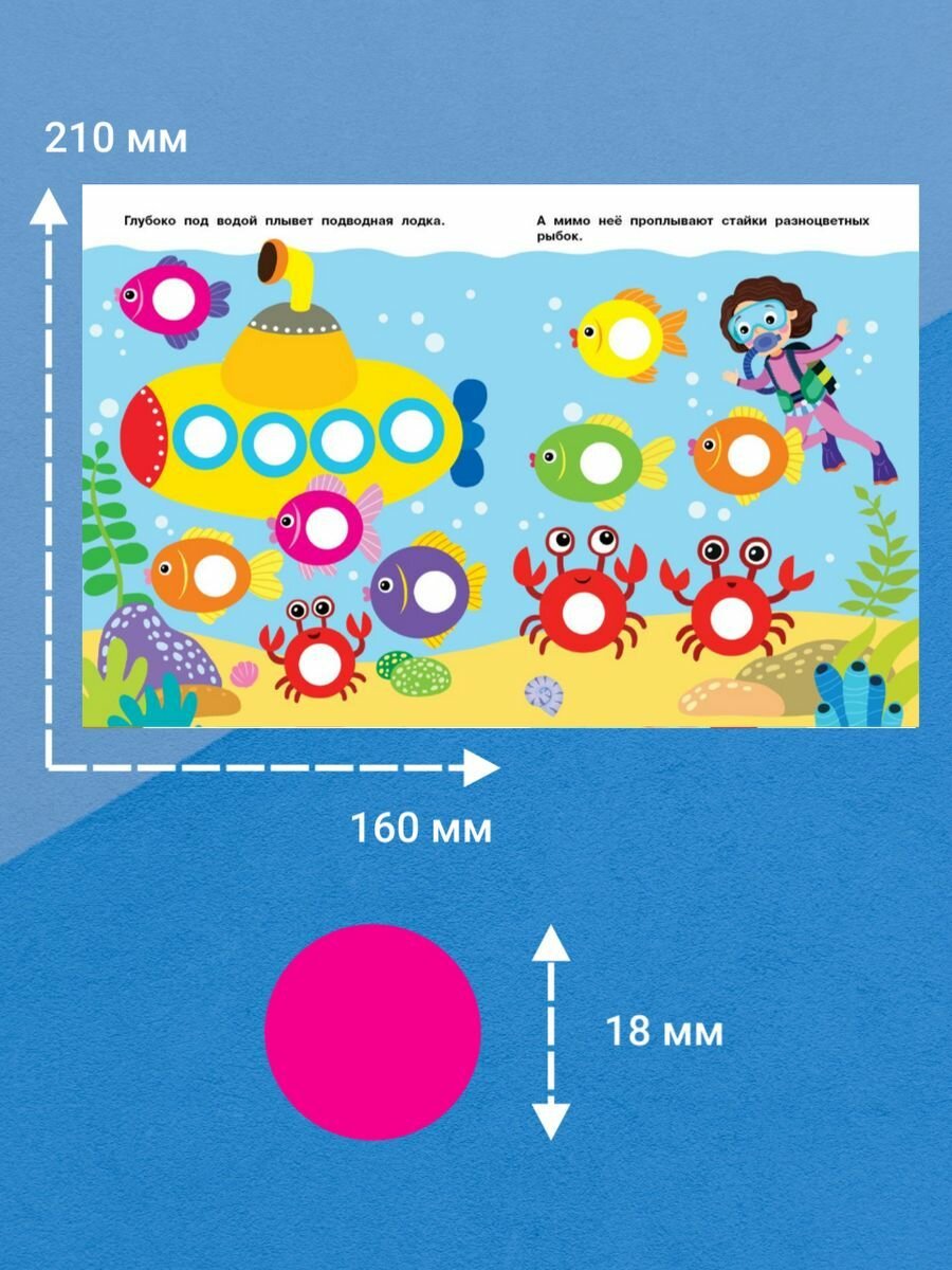 Приклеивая на картинки в этой книге яркие разноцветные многоразовые наклейки-кружочки, ваш малыш сможет повторять названия цветов и предметов, развивать мелкую моторику и усидчивость.