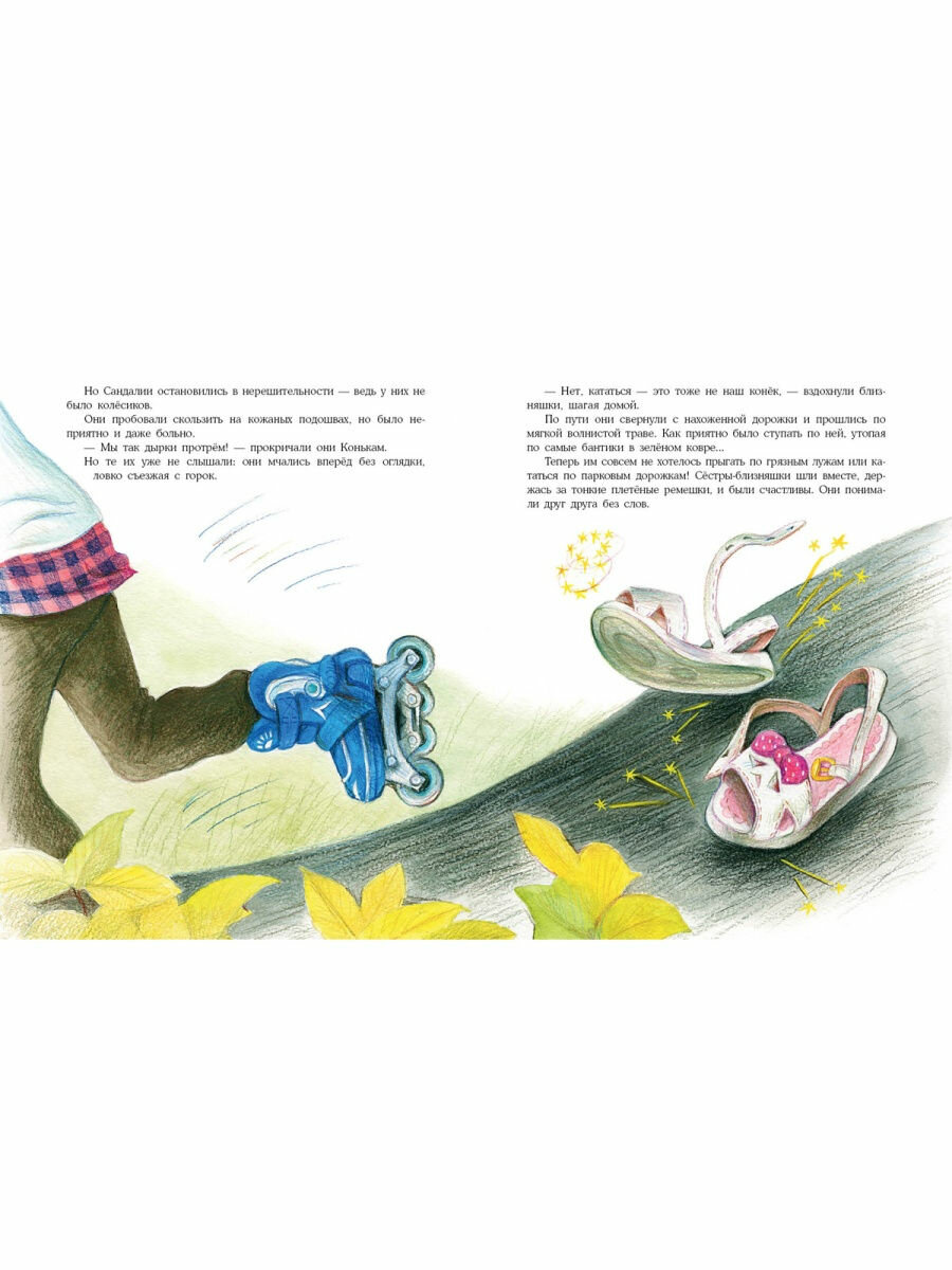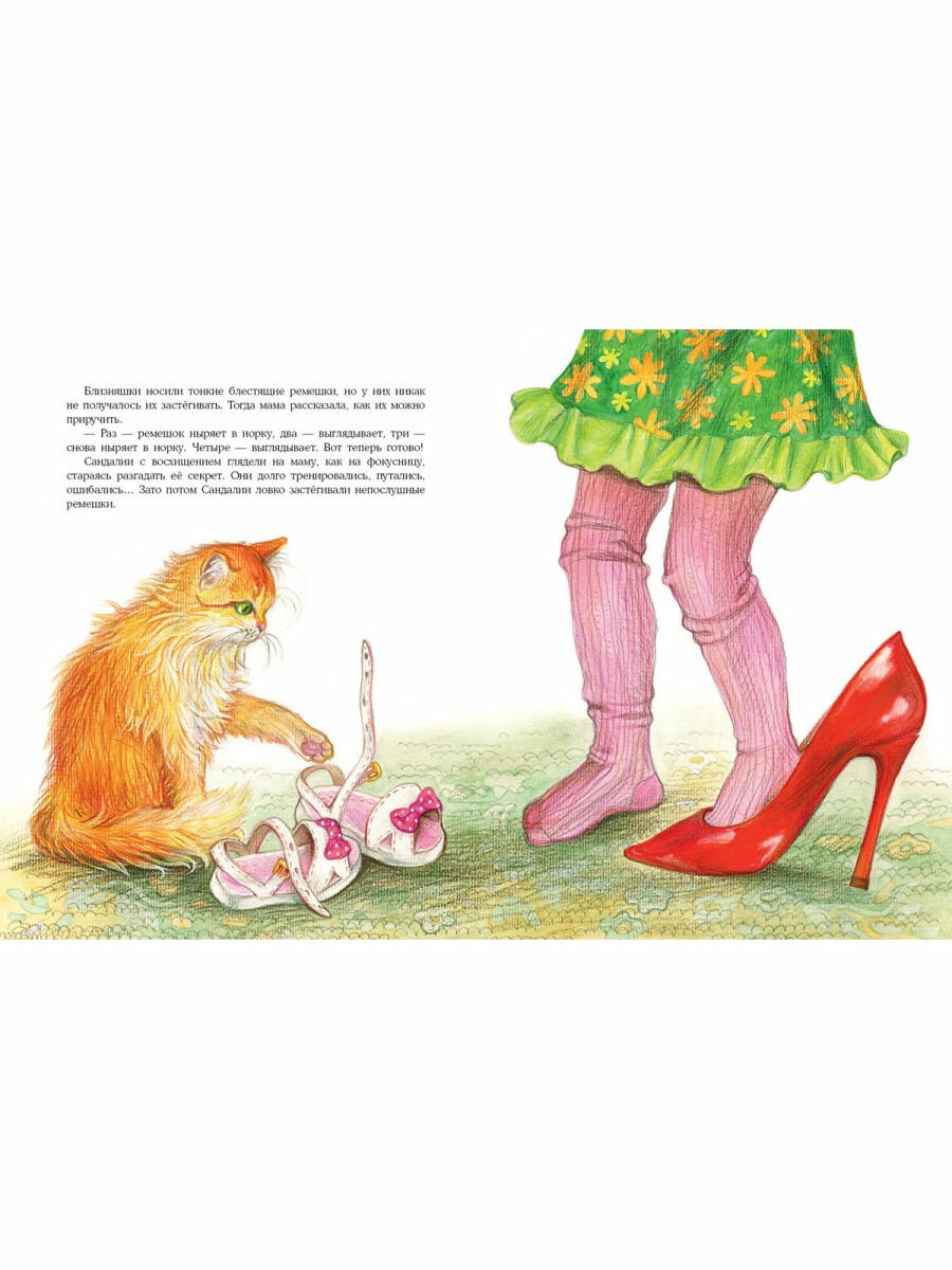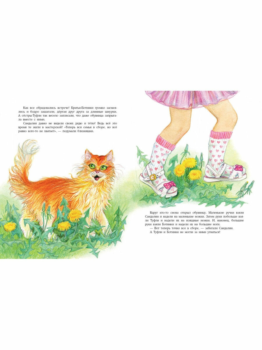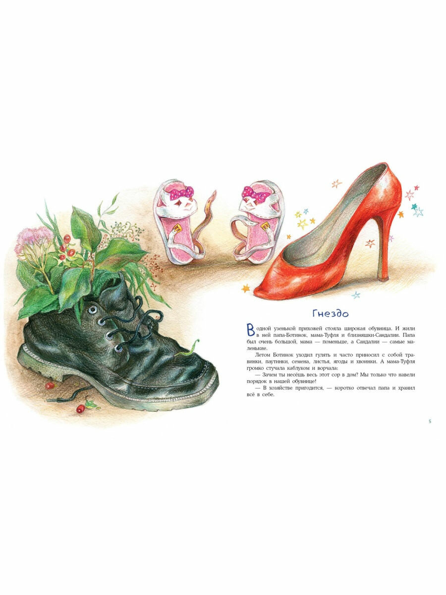 В этой книжке увлекательно описывается семейная жизнь обуви. Оказывается там всё, как у людей. Дом-обувница. Папа-Ботинок, который находит на улице маленькие сокровища и тащит их в дом. Мама-Туфля, которая стучит каблуком и ругается на папу за то, что тот тащит «сор в дом», потому что она только что навела порядок в обувнице. И близняшки-Сандалии, которые ищут друзей и мечтают укротить непослушные ремешки.