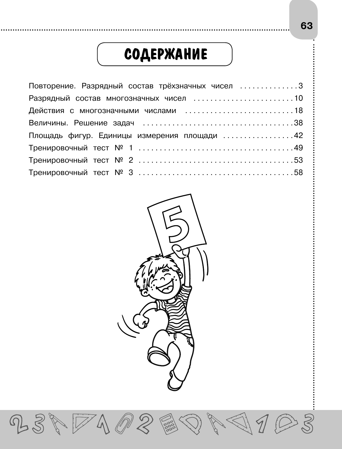 Тренажер, соответствующий ФГОС, содержит практический материал по основным темам математики для повторения и закрепления знаний. Разнообразные задания позволят учащимся понять образование многозначных чисел, закрепить навык решения примеров на сложение, вычитание, умножение и деление. В конце пособия даны комплексные проверочные тесты, состоящие из двух частей: часть А является обязательной, часть В содержит задания повышенной сложности, которые учащие могут выполнять по выбору. Пособие можно использовать на уроках математики, при подготовке к урокам, контрольным работам и ВПР.