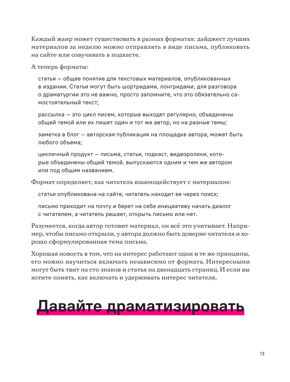 Но даже в этом случае есть способ сделать текст интересным: в этом помогают приемы драматургии. Книга "Уступите место драме" рассказывает, как захватить внимание читателя на разных уровнях: темой, подачей, заголовком, акцентами, композицией, конфликтом. Это всё доступно в коммерческом тексте и даже если у автора мало времени на работу.