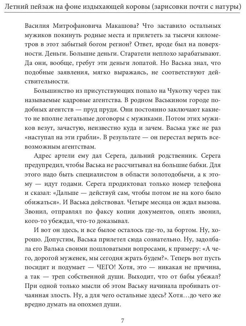 Как попасть на Крайний Север? Очень просто. Надо купить билет и сесть в самолет. В далеком, 2004-м году автор так и сделал. Итоги пребывания легли в основу повести "Летний пейзаж на фоне издыхающей коровы (зарисовки почти с натуры)". Чего в этой повести больше: смеха, или – слез? Решать – читателю.