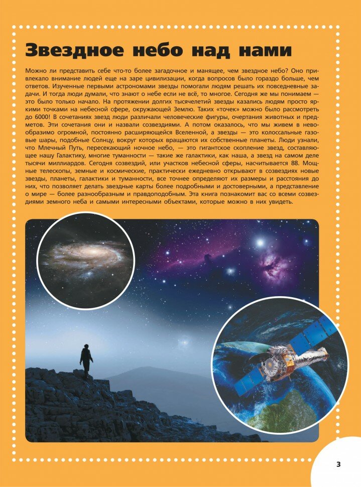 Настоящим подарком для юных любознательных астрономов и их родителей станет этот атлас. Он познакомит читателей со всеми 88 созвездиями звездного неба, с самыми яркими звездами и их планетами, а также с галактиками, туманностями и звездными скоплениями, которые наблюдаются в этих созвездиях. Вы узнаете, как появилась Вселенная и что с ней происходит сегодня, как устроены галактики и что отличает их от туманностей, как люди изучают звездное небо и что дают им эти знания. Но основная часть издания посвящена созвездиям. Здесь описываются созвездия Северного и Южного полушарий неба и экваториальные. В атласе вы найдете информацию о том, где и когда удобнее наблюдать каждое из созвездий, а также интересные факты и легенды о них. Все это обязательно привлечет внимание любителей исследования звездного неба и позволит заглянуть за горизонт, чтобы приподнять завесу тайны над устройством мира, в котором мы живем.