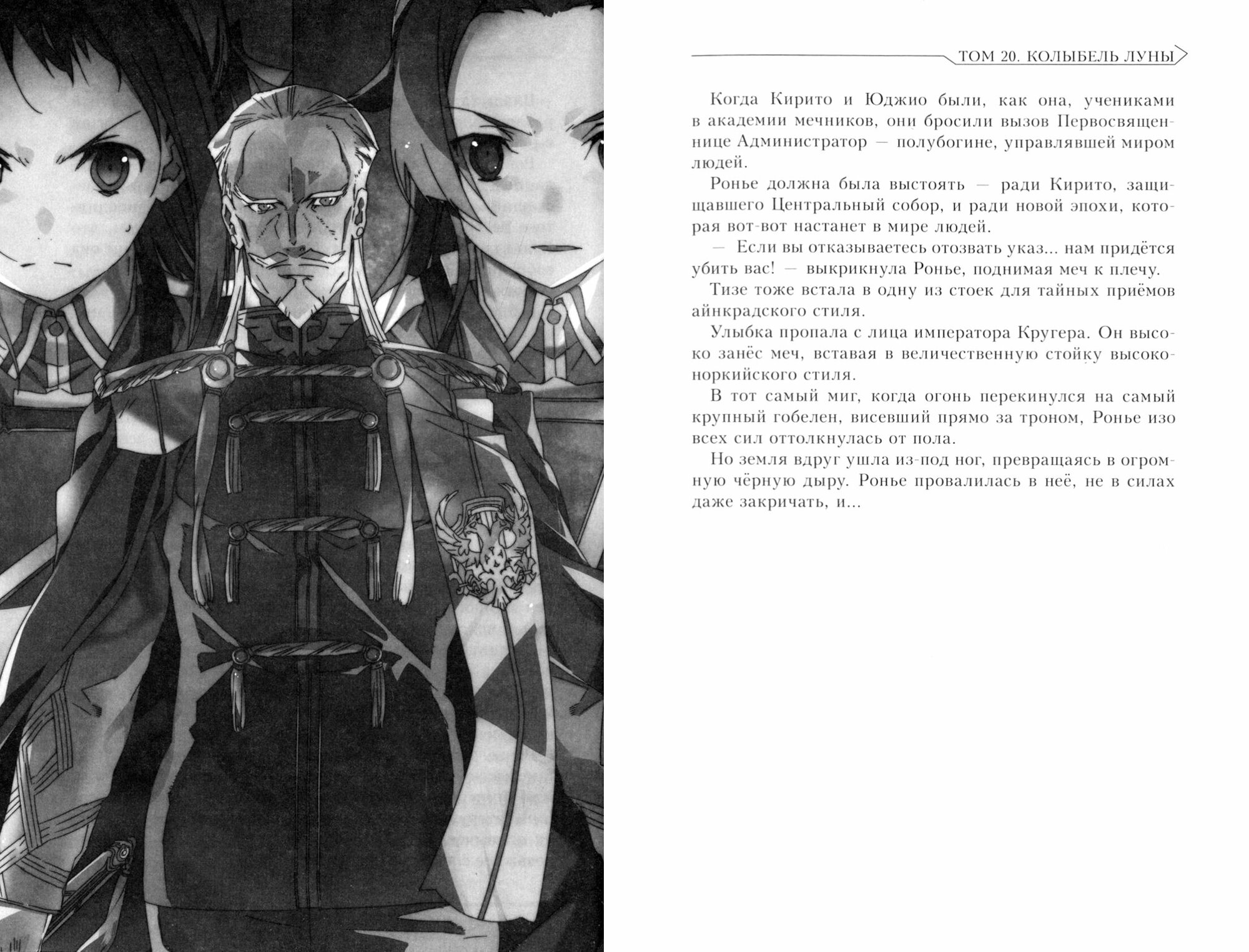 20 том \"Масеров Меча Online\" продолжает сюжетную арку \"колыбели луны\", которая в свою очередь является ответвлением про приключения Кирито и Асуны, застрявших в мире Андэрворлда на долгие года. Большим плюсом для меня стало то, что история теперь концентрируется не только на полюбившихся нам ещё с первого тома героях, но и на мало раскрытых персонажах \"Алисизации\", а также порадовало высокое содержание политических интрижек, не свойственных серии.