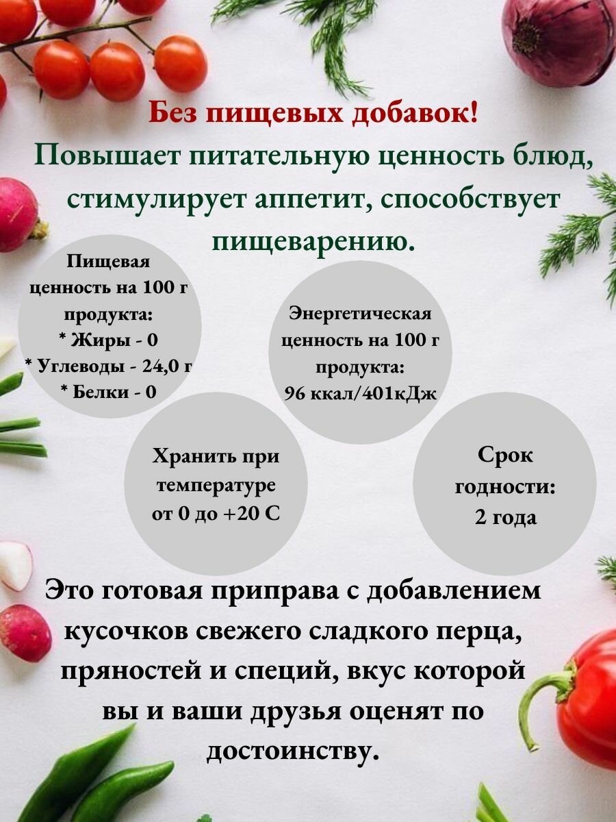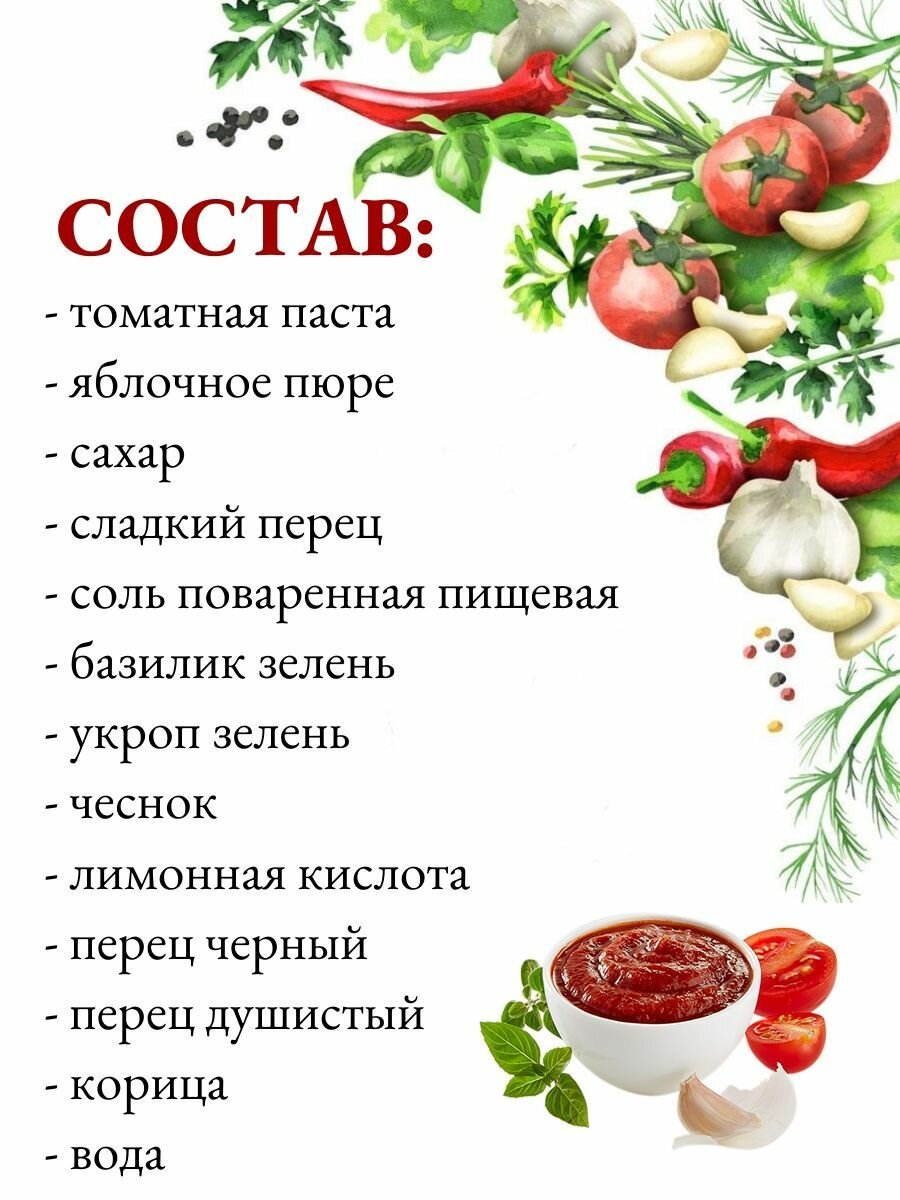 | Состав | томатная паста, яблочное пюре, сахар, сладкий перец, соль поваренная пищевая, базилик зелень, укроп зелень, чеснок, лимонная кислота-регулятор кислотности, перец черный горький, перец душистый, корица, вода |