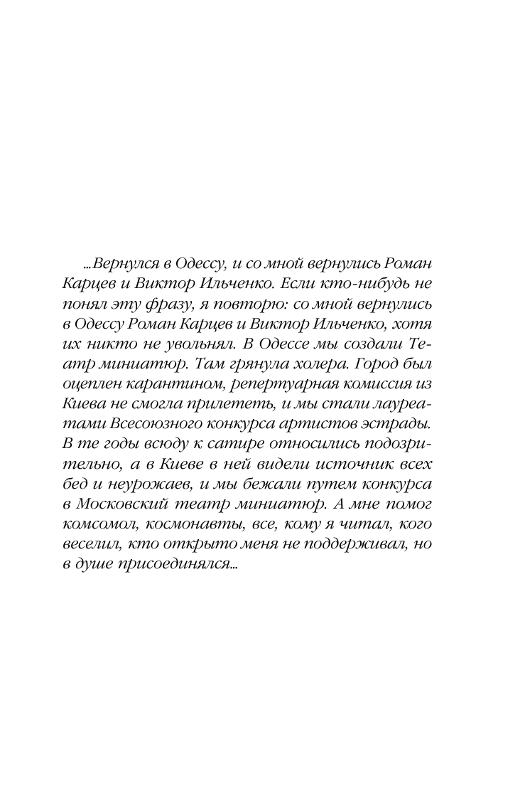 Вернулся в Одессу, и со мной вернулись Роман Карцев и Виктор Ильченко. В Одессе мы создали театр миниатюр. В те годы всюду к сатире относились подозрительно, а в Киеве в ней видели источник всех бед и неурожаев, и мы бежали путем конкурса в Московский театр миниатюр. А мне помог комсомол, космонавты, все, кому я читал, кого веселил, кто открыто меня не поддерживал, но в душе присоединялся.