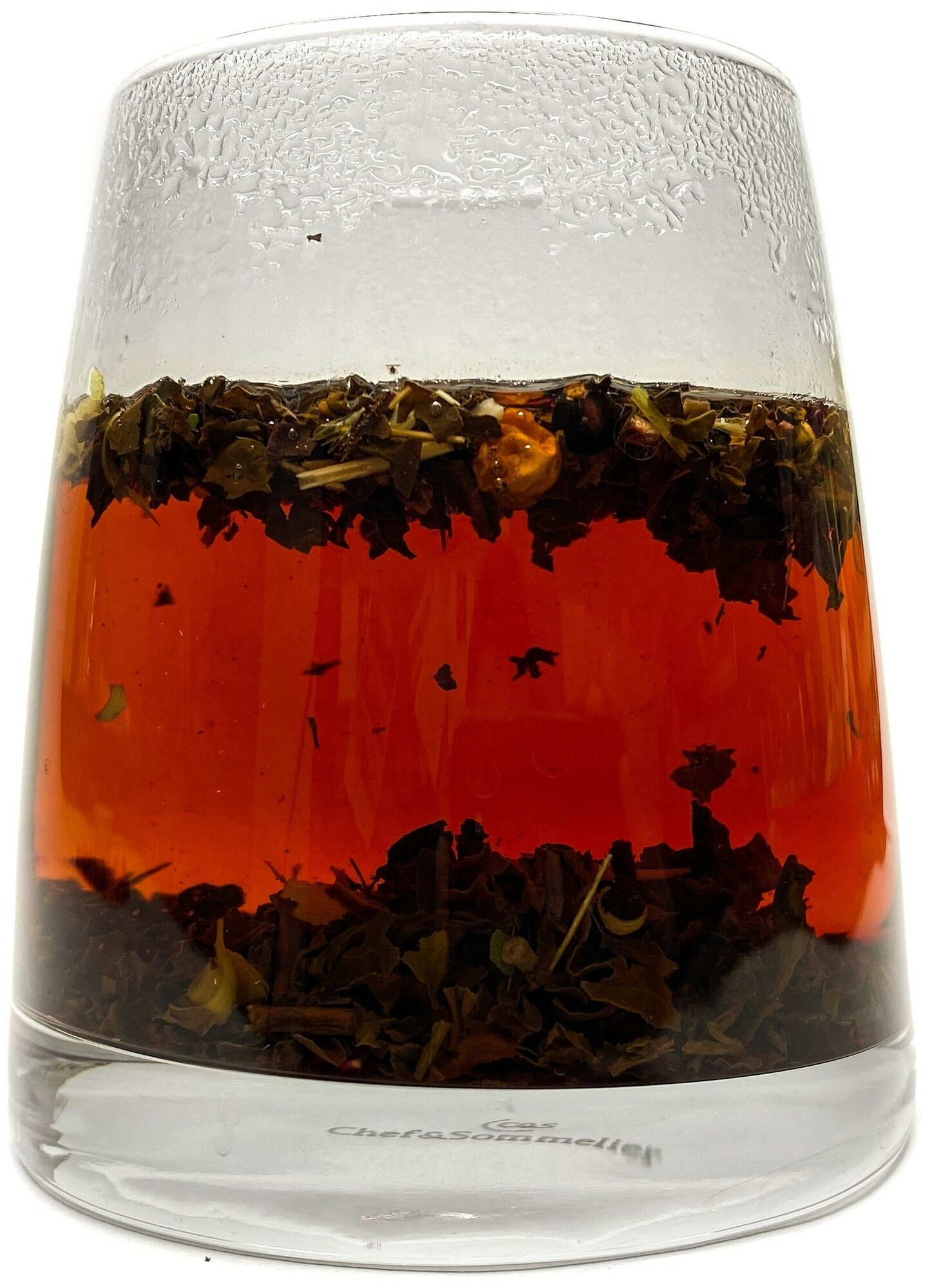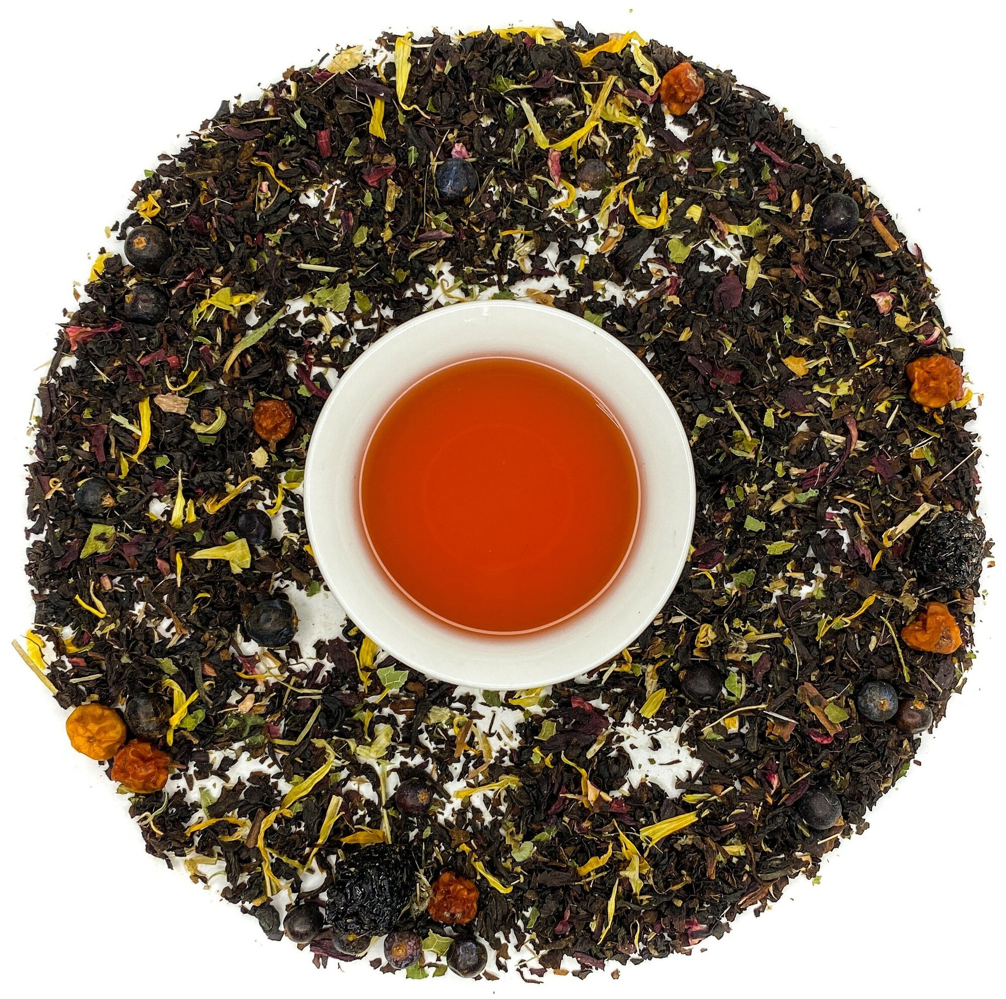 Чай черный, рябина, можжевельник, ежевика, гибискус, зверобой, липа, календула. Ароматизирован натуральными маслами. Восстановит силы и укрепит здоровье.