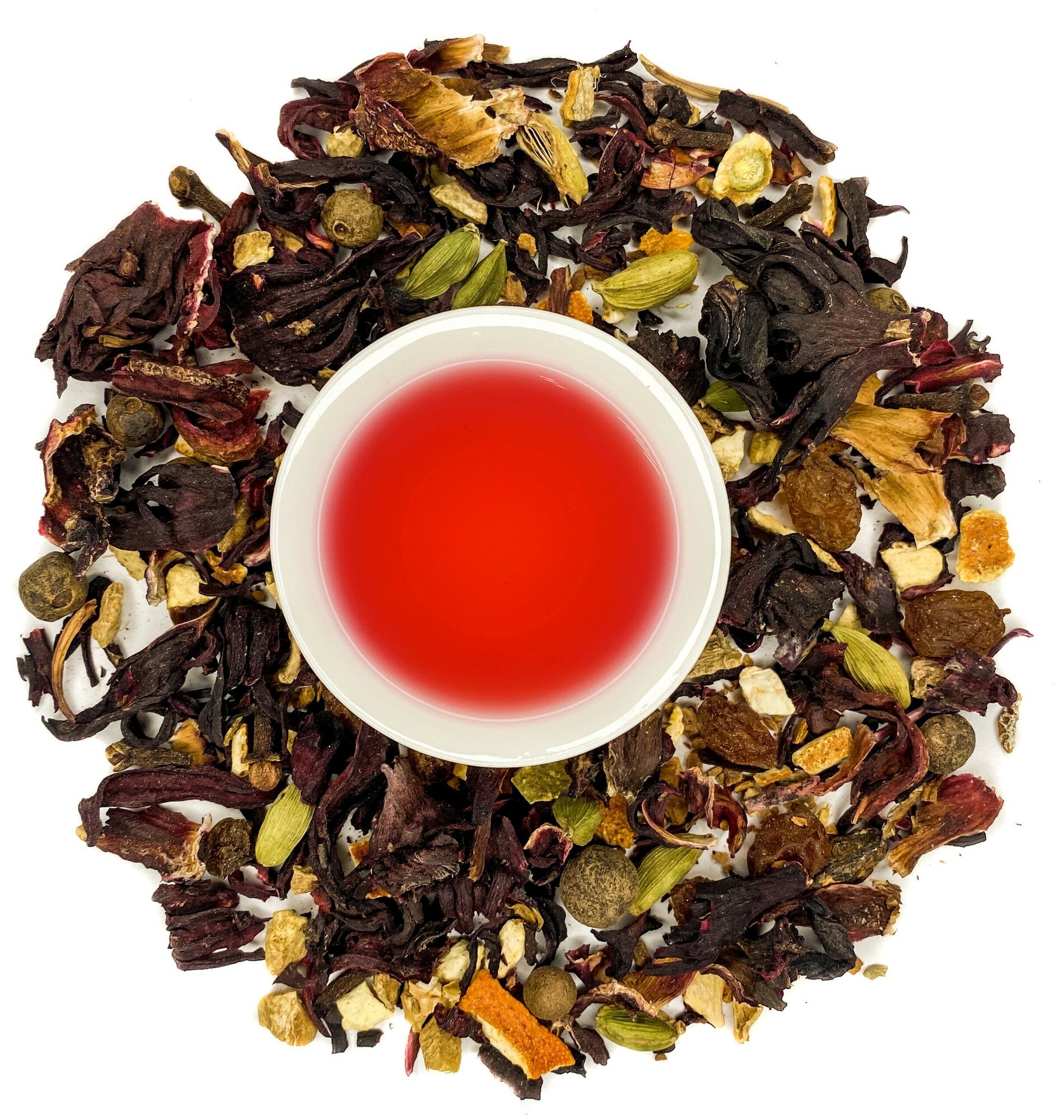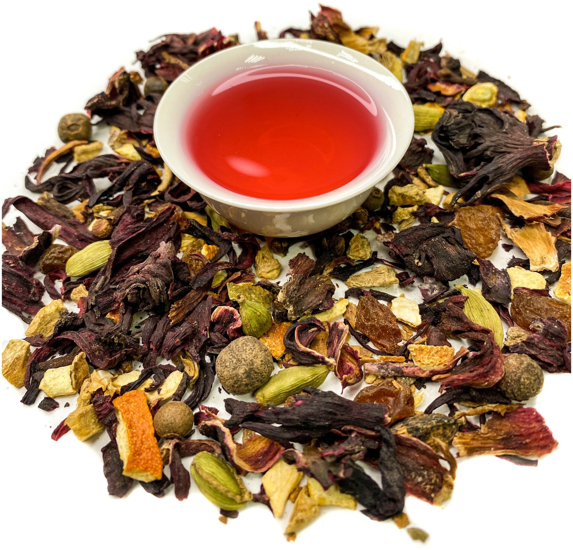 Гибискус, изюм, имбирь, корица, кардамон, гвоздика, душистый перец, мускатный орех, кусочки апельсина. Ароматизирован натуральными маслами.Чайный глинтвейн можно пить горячим и холодным.