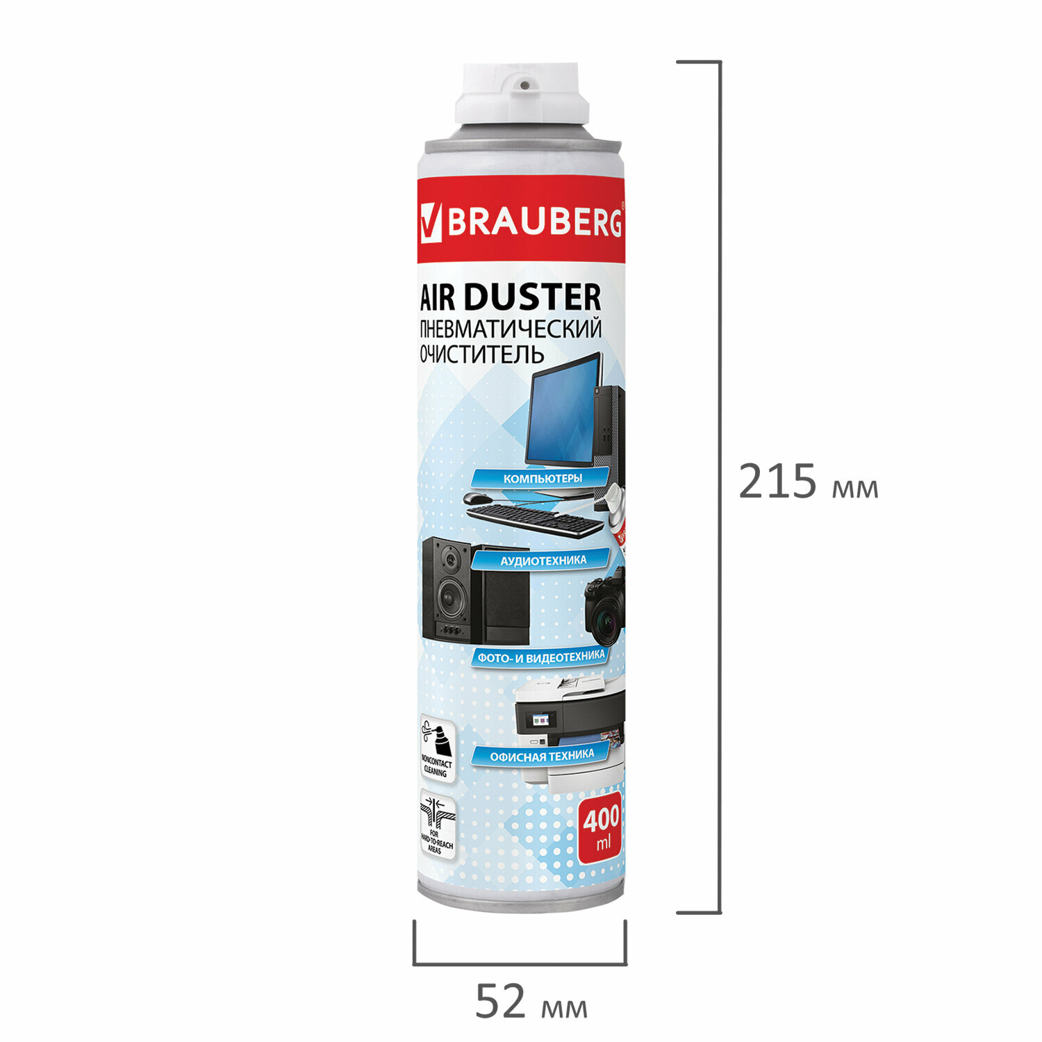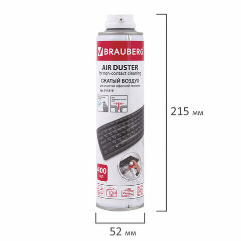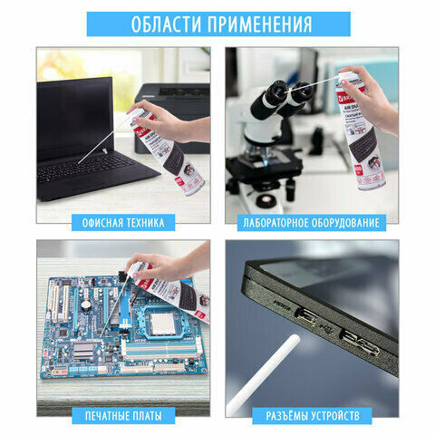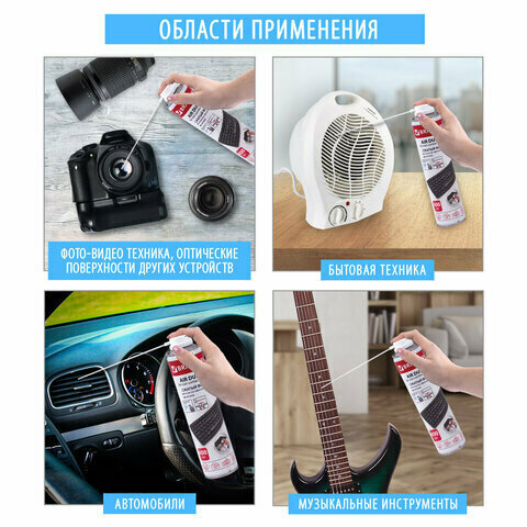 Баллон со сжатым воздухом предназначен для бесконтактного удаления пыли и мелкого мусора из труднодоступных мест и внутреннего пространства компьютерной техники, аудио-, видео- и фотоаппаратуры, офисной и бытовой техники.